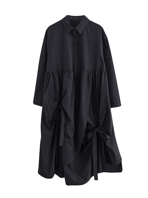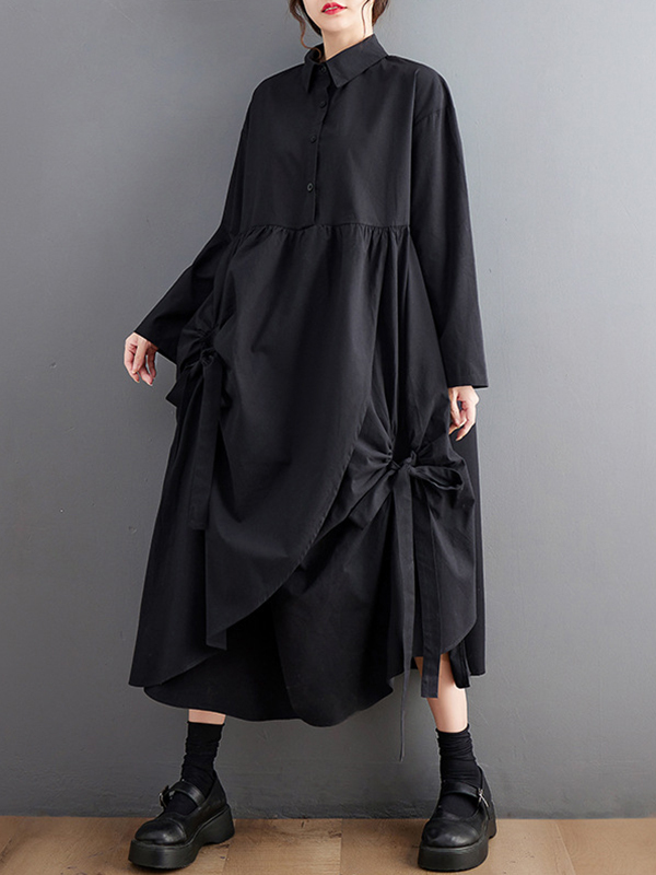 A-Line Long Sleeves Buttoned Pleated Pockets Solid Color Tied Lapel Midi Dresses Shirt Dress