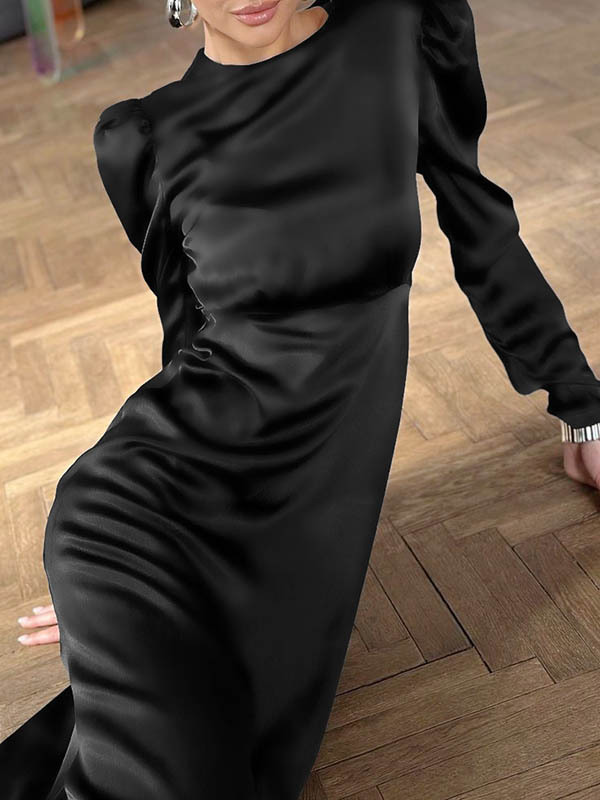 A-Line Long Sleeves Pleated Solid Color Zipper Round-Neck Midi Dresses