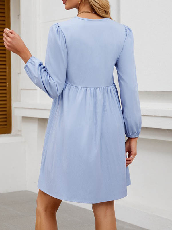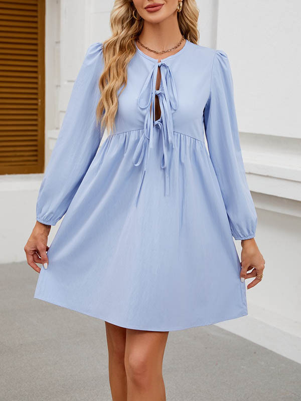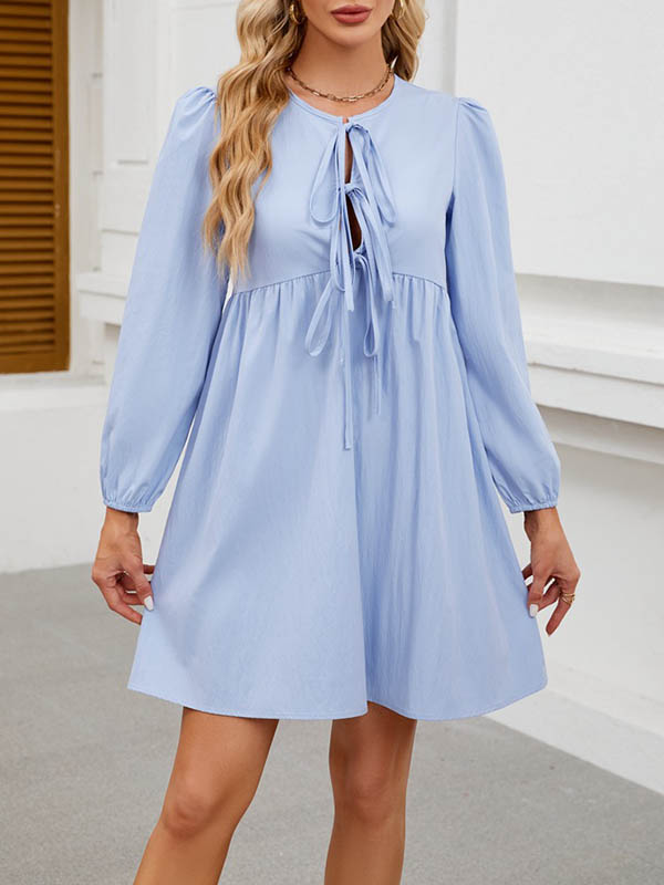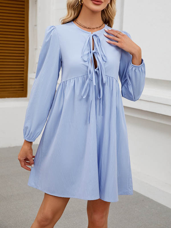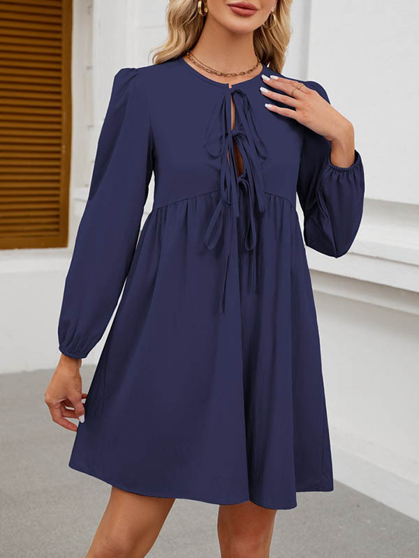 A-Line Loose Elasticity Hollow Lace-Up Pleated Solid Color Split-Joint Round-Neck Mini Dresses Shirt Dress