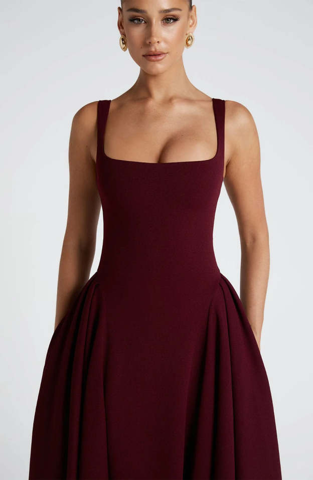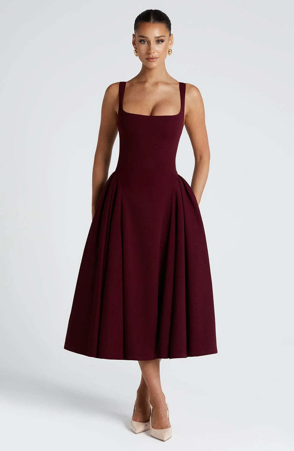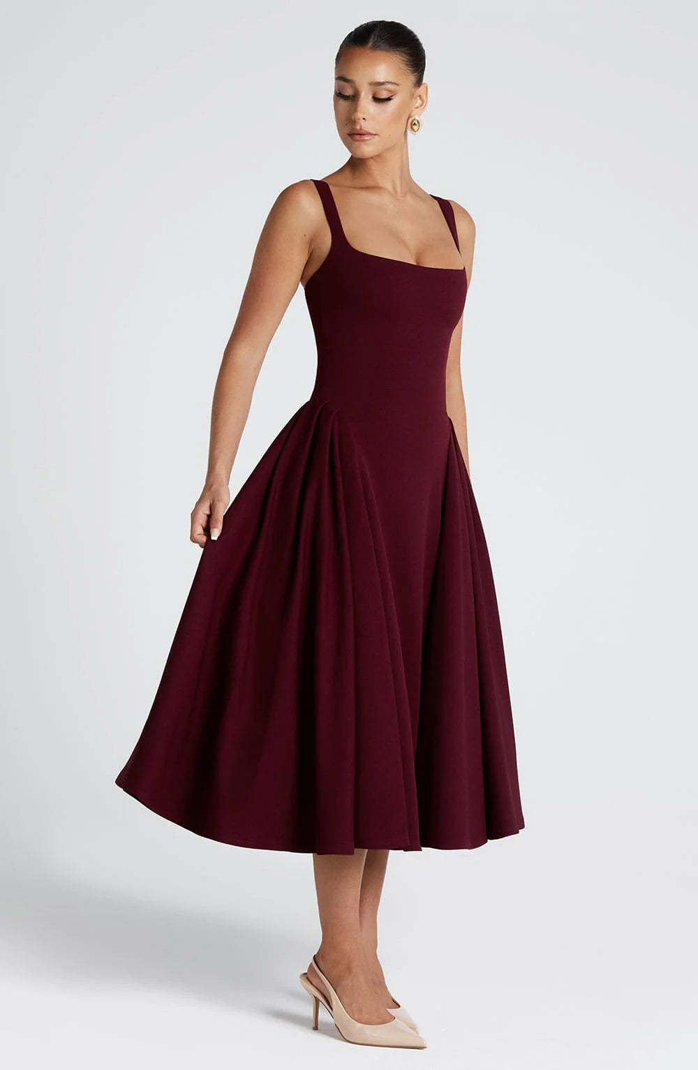 Embrace timeless grace in a dress designed to celebrate every movement. Crafted from premium stretch crepe, it contours the body before flowing into a softly flared midi skirt. A chic square neckline is complemented by fan-shaped straps that frame the décolletage, while discreet godet panels—tipped with tulle—add a whisper of volume and romance.