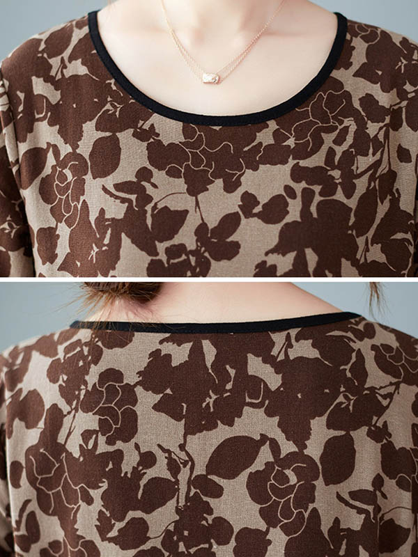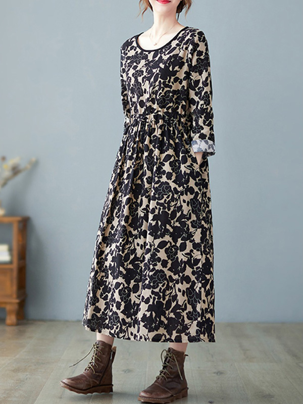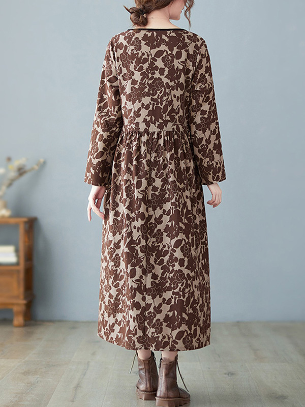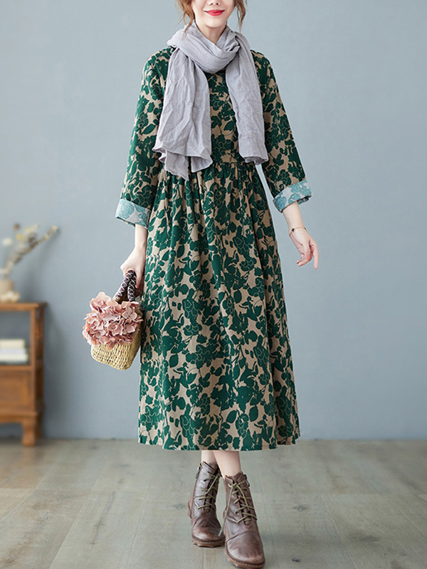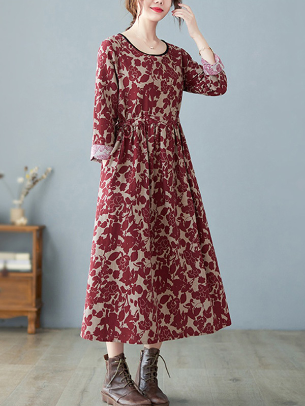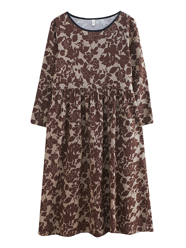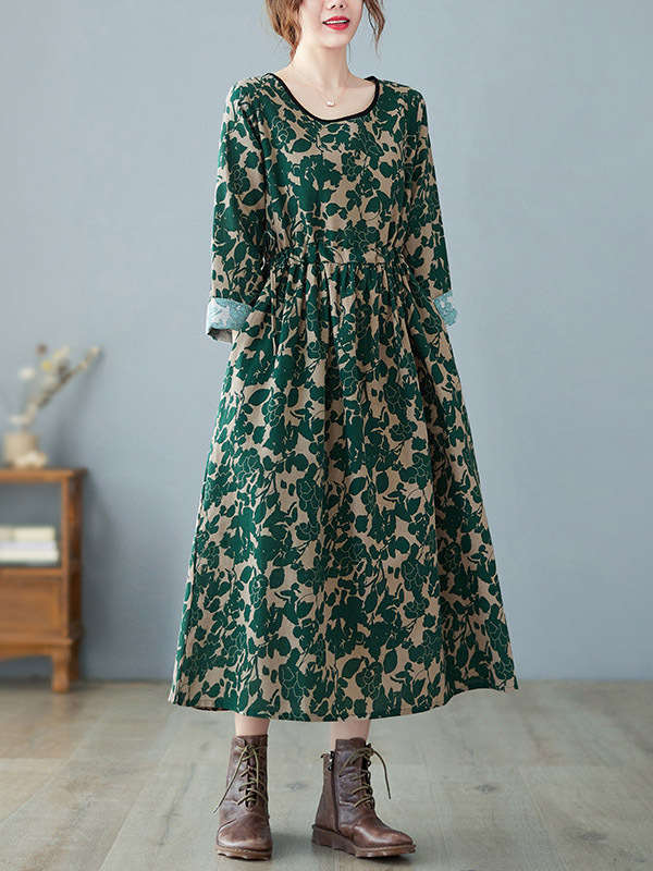 Artistic Retro Ramie Cotton Floral Printed Pleated Round-Neck Long Sleeves Midi Dress