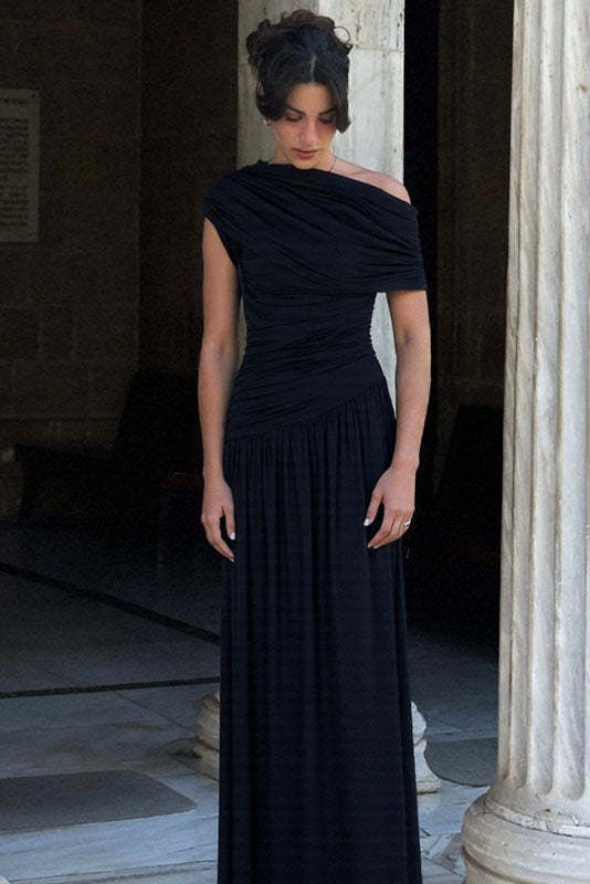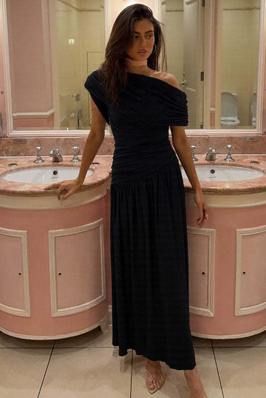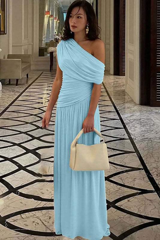 This one-shoulder maxi dress features asymmetric ruched design and bold patchwork details. With its modern elegance and sensual edge, it's the perfect choice for parties, dinners, and formal occasions.