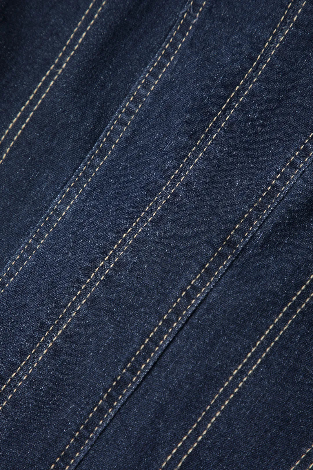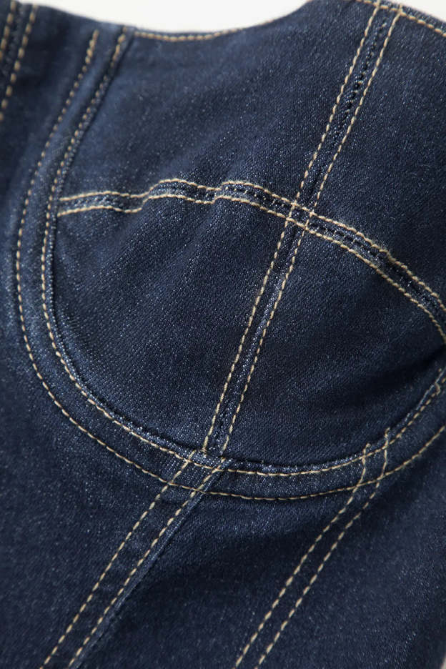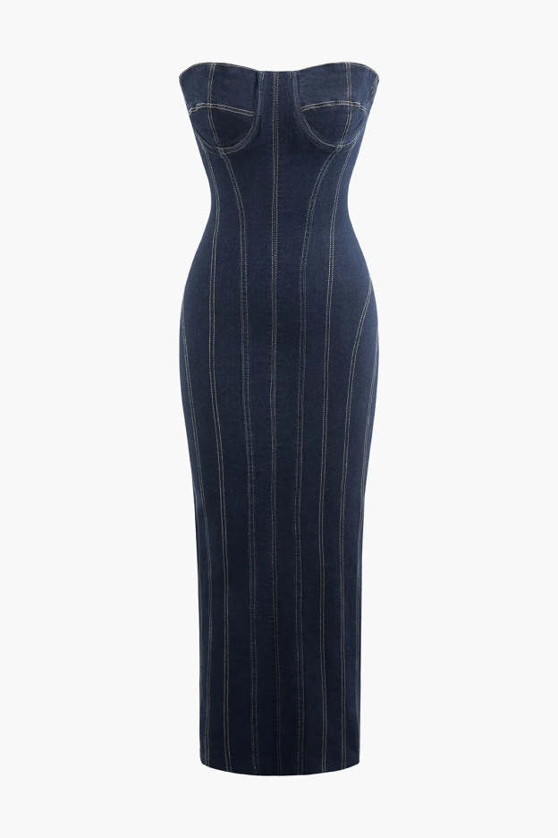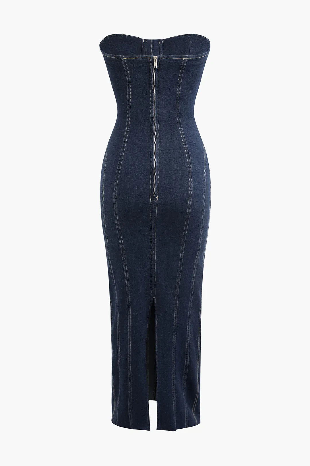 Basia Blue Slit Denim Zipper Strapless Maxi Dress