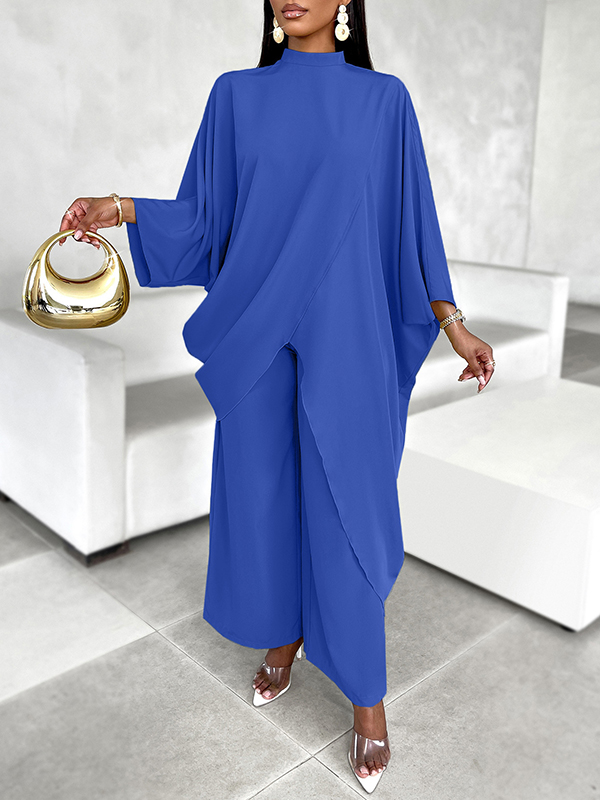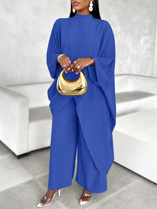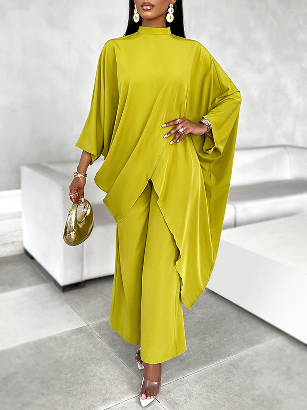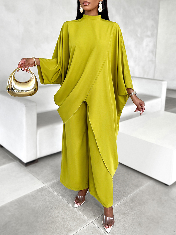 Batwing Sleeves Long Sleeves Asymmetric Hollow Solid Color Mock Neck T-Shirt Top + Pants Bottom Two Pieces Set