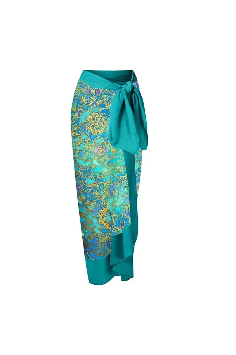 Ethnic floral print, ruffled neckline, wrap skirt included, stretchy quick-dry material, flattering cut