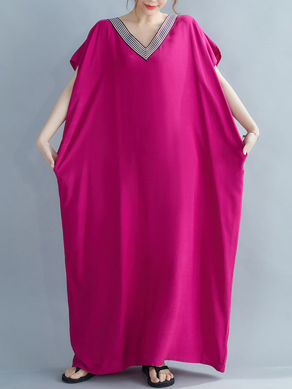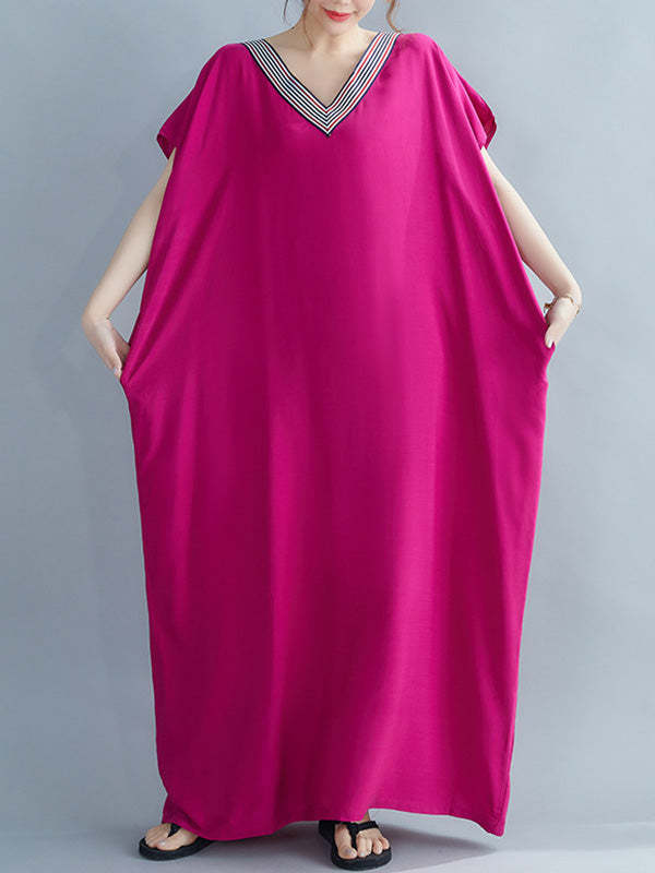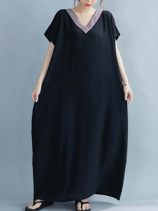 Casual Artistic Retro Striped V-Neck Short Sleeves Maxi Dress