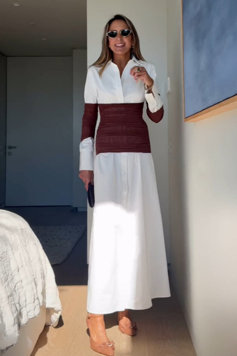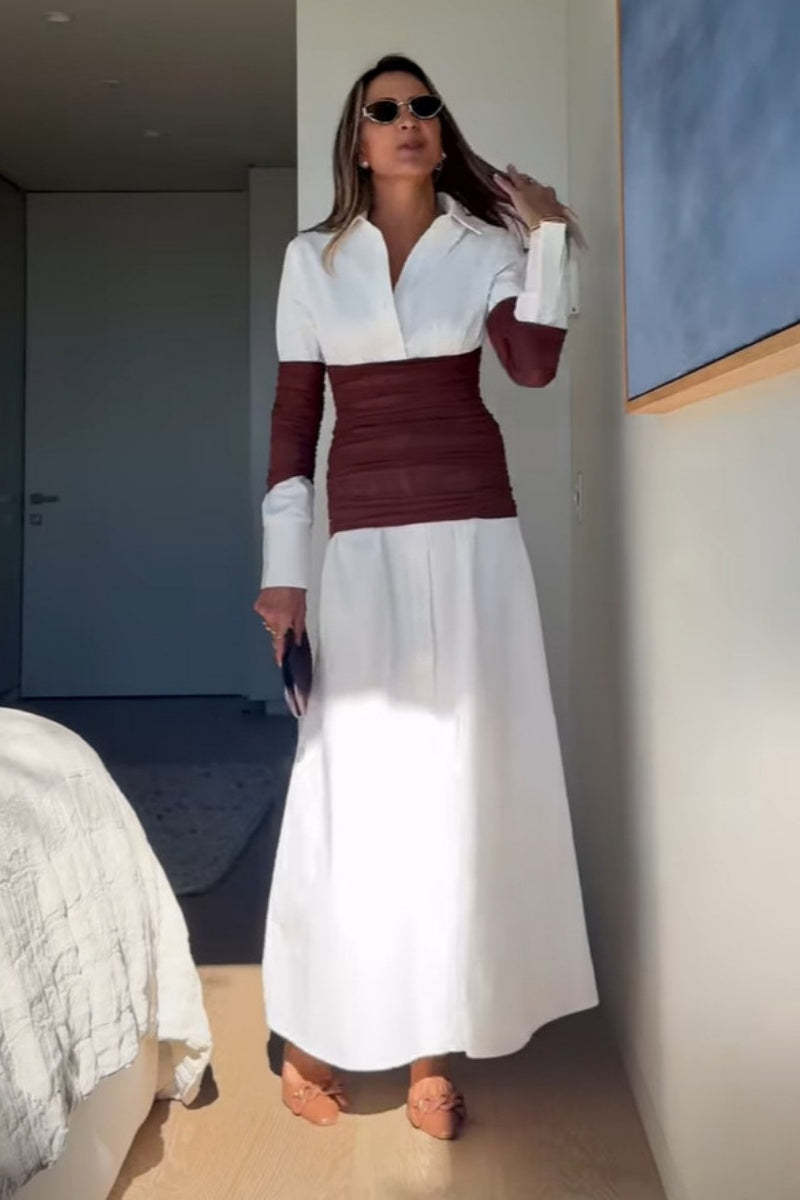 Make a bold style statement with this contemporary color-block shirt dress that redefines modern sophistication. The innovative panel construction creates striking geometric contrasts, while the dramatic side slit adds a touch of allure to the classic shirt dress silhouette. Featuring a structured collar and hidden button placket, this piece seamlessly blends tailored precision with effortless cool. Perfect for fashion-forward individuals who appreciate architectural design in everyday elegance.