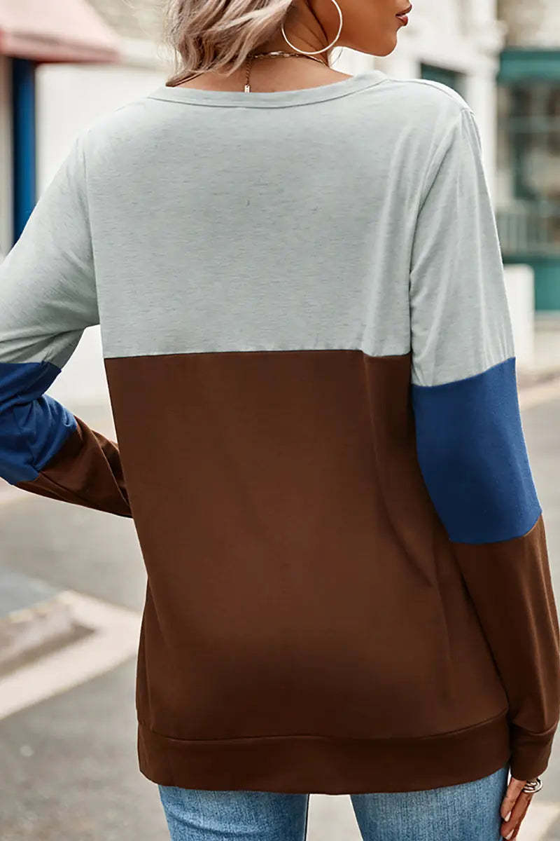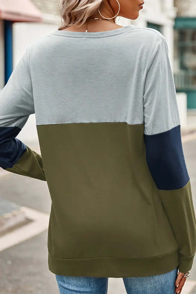 A trendy women's sweatshirt featuring a colorblock design, hollow-out elements, a low round neckline, and a loose, comfortable fit. Perfect for effortless casual style.