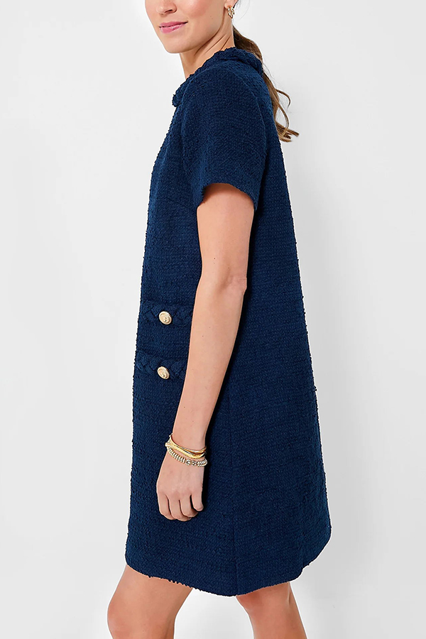 This dress is designed to make you feel confident and stylish. The beauty is in the details—from the textured tweed fabric to the luxurious braided trim and vintage-inspired buttons. The straight silhouette is tailored to fit yet effortlessly wearable. making it a wardrobe icon. From drinking coffee to meeting clients. everyone needs it in their life.