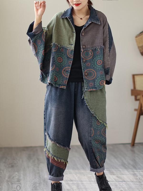 Contrast Color Fringed Split-Joint Long Sleeves Printed Outwear + Harem Pants Two Pieces Set