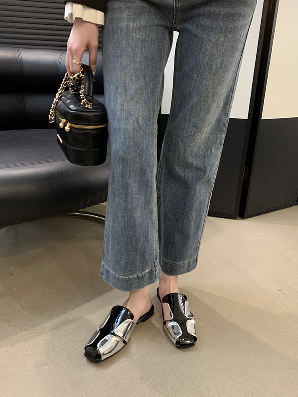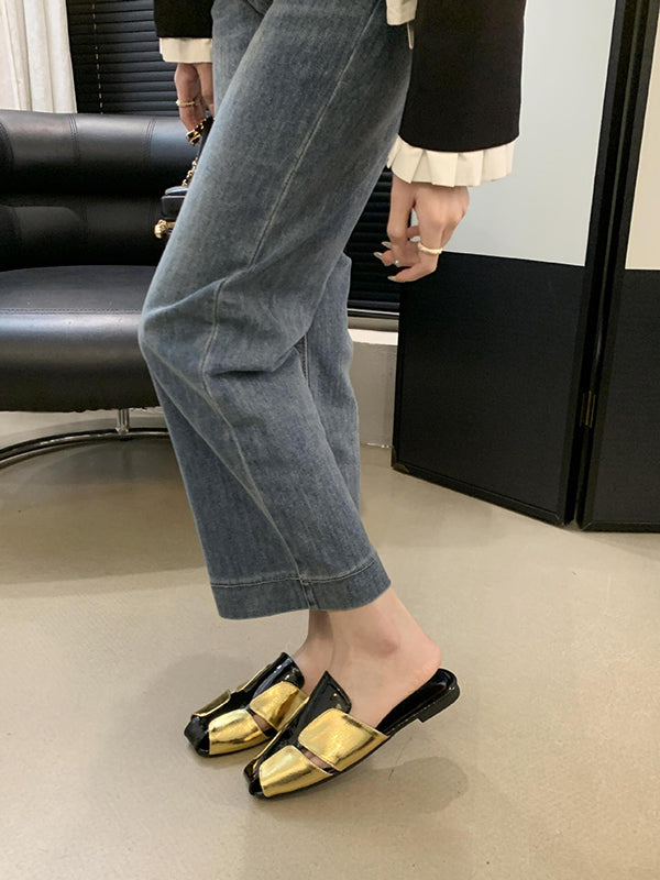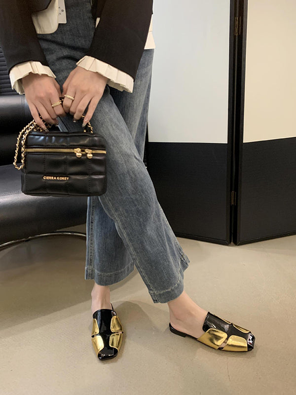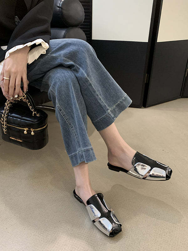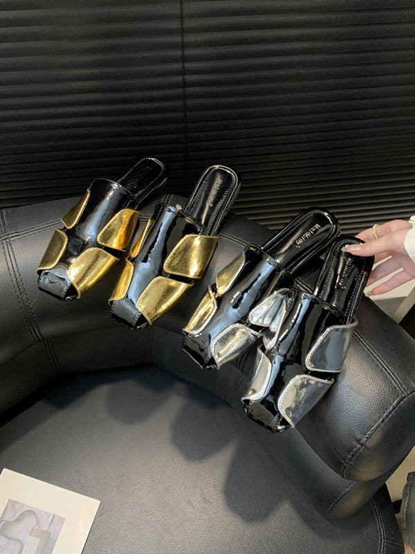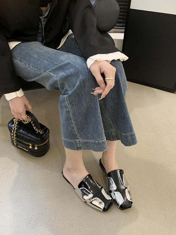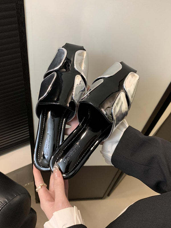 Contrast Color Hollow Split-Joint Square-Toe Sandals Slippers&Mules