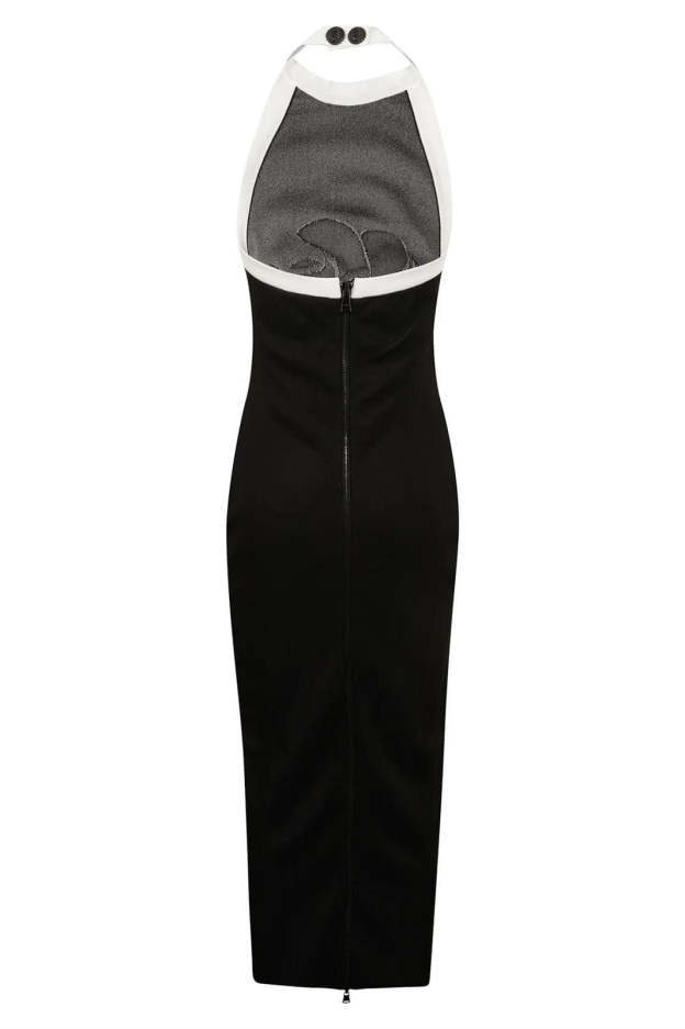 Embrace elegance with the Rose Motif Halterneck Midi Dress. Featuring a stylish halterneck design, sleeveless cut, and a charming rose motif, this dress stands out with its open back and contrasting trim. Crafted from high-stretch knitwear, it offers a flattering fit and superior comfort.