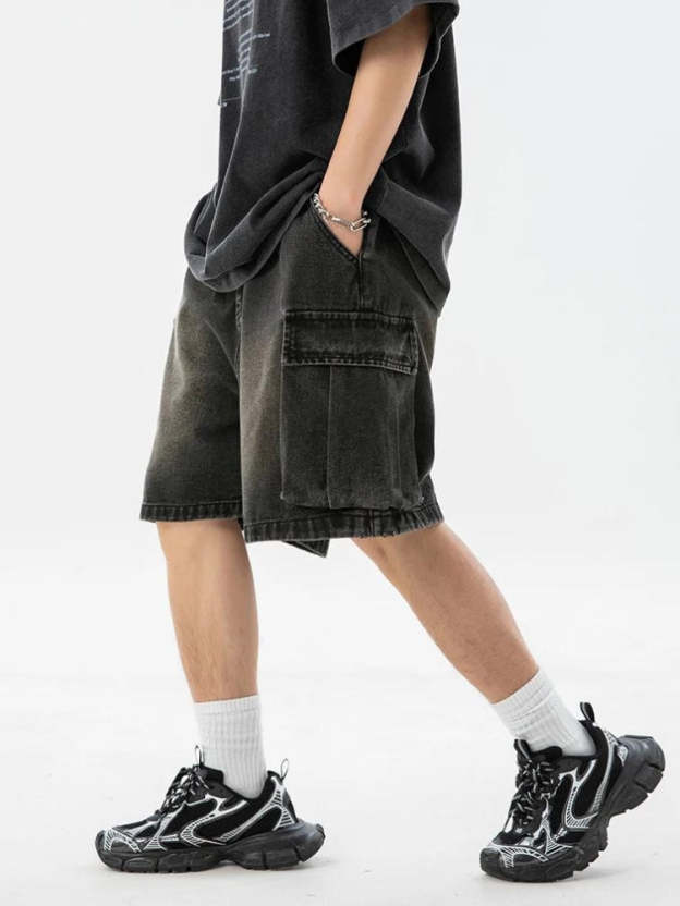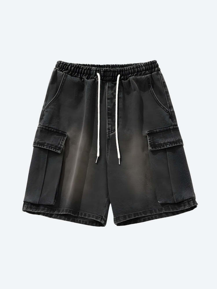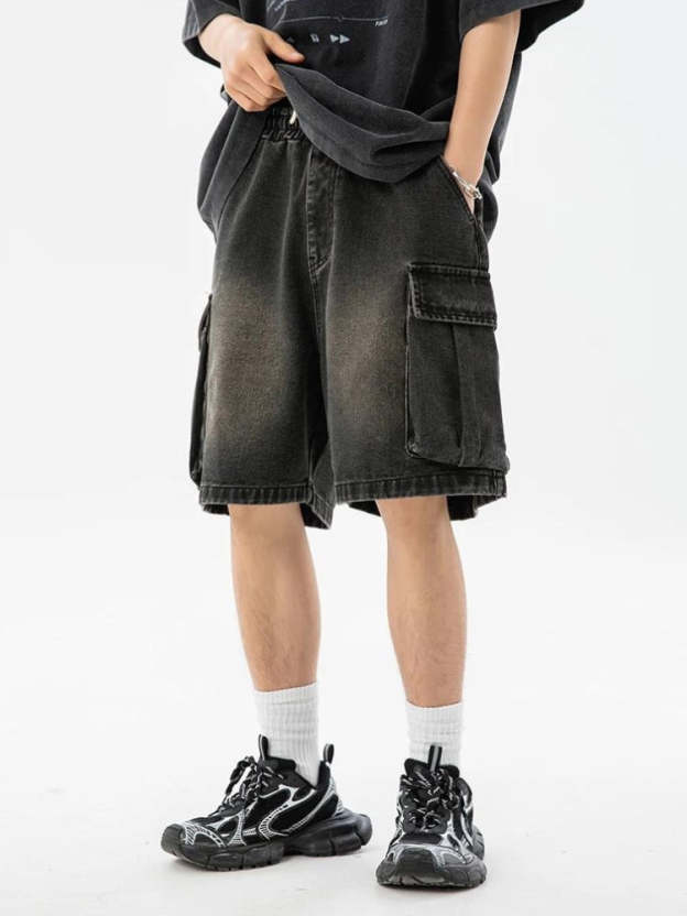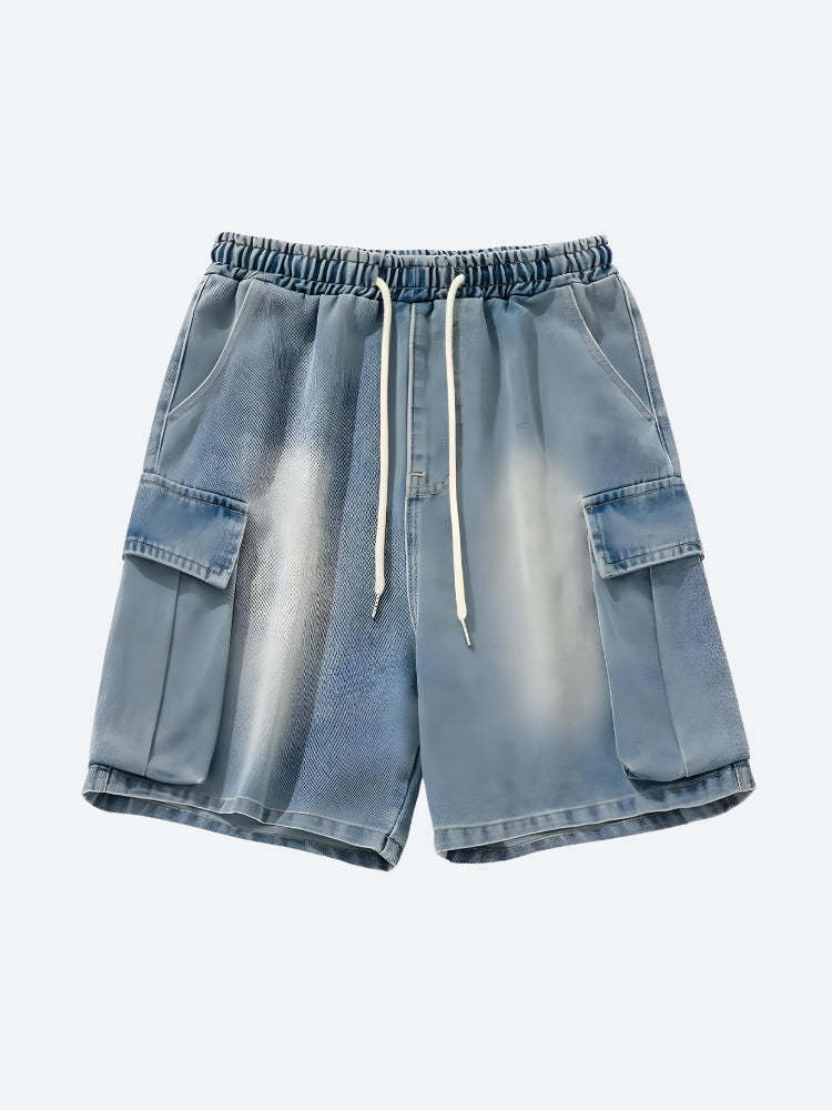Experience comfort and utilitarian style with these relaxed-fit shorts. An elastic waistband with a drawstring ensures an adjustable fit, while multiple cargo pockets add functionality. The faded denim offers a trendy, worn-in look, perfect for casual outings. Pair with a simple tee or hoodie for a laid-back streetwear vibe.