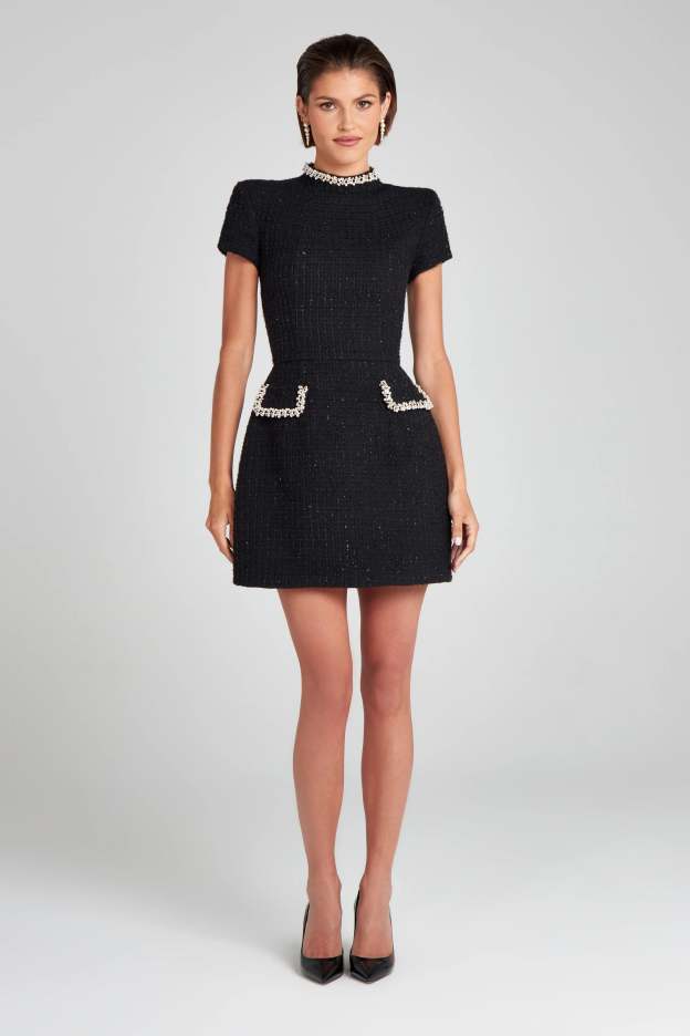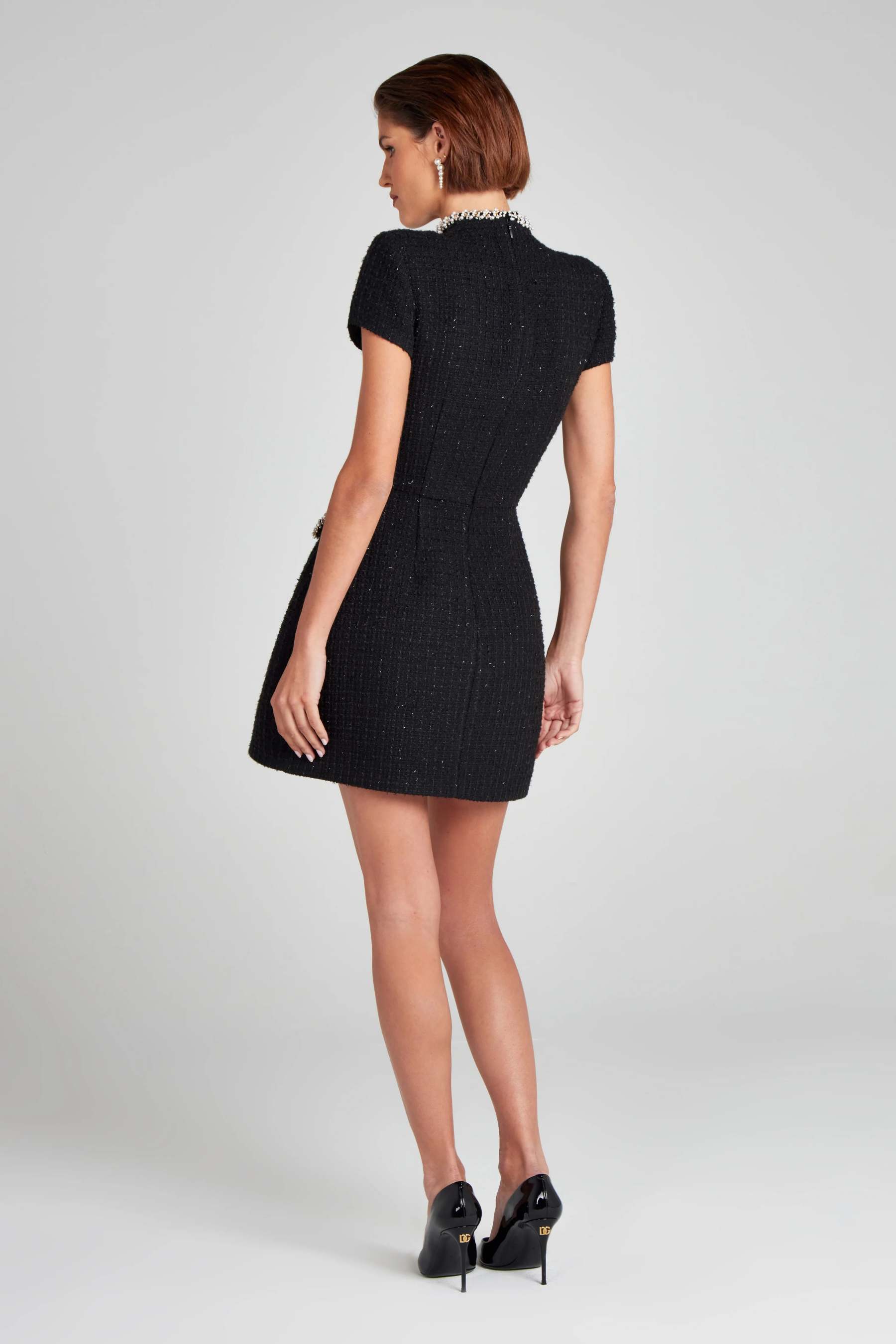 Sophisticated and structured, the Elisette Mini Dress blends vintage-inspired tailoring with modern elegance. Crafted from a black and white bouclé tweed infused with subtle shimmer, this piece features a contoured bodice, capped sleeves, and internal shoulder pads for a sculpted, confident fit. Pearl and ivory velvet chain trim highlights the high neckline and decorative front pockets, while the signature tulip skirt adds volume and refinement. Finished with functional side pockets and a concealed zip, it’s ideal for elegant luncheons, winter events, or polished evening occasions.