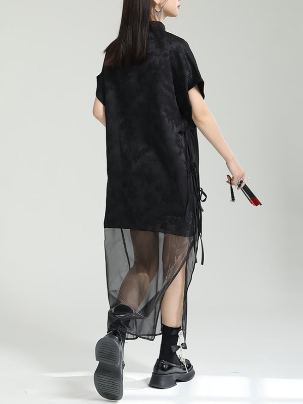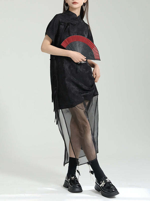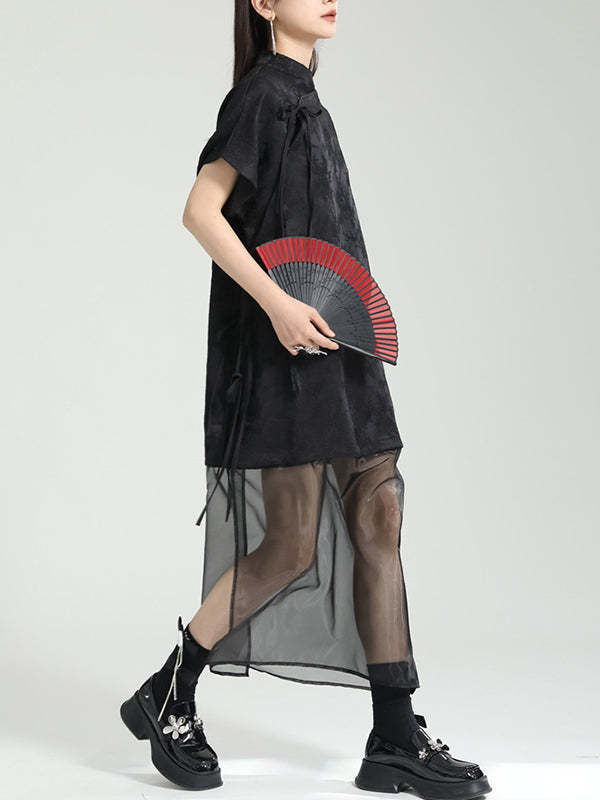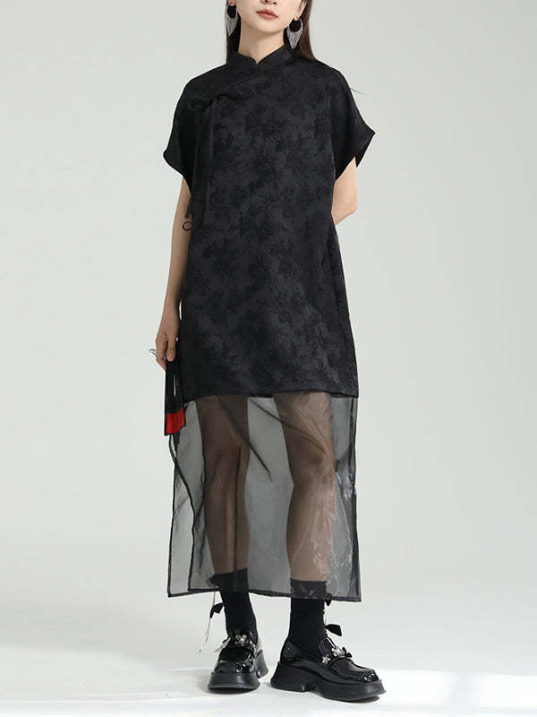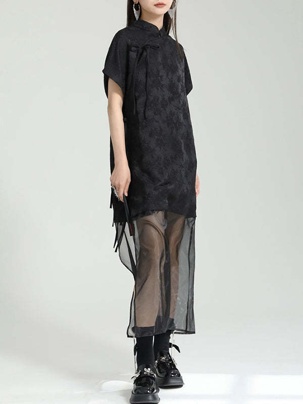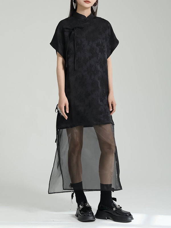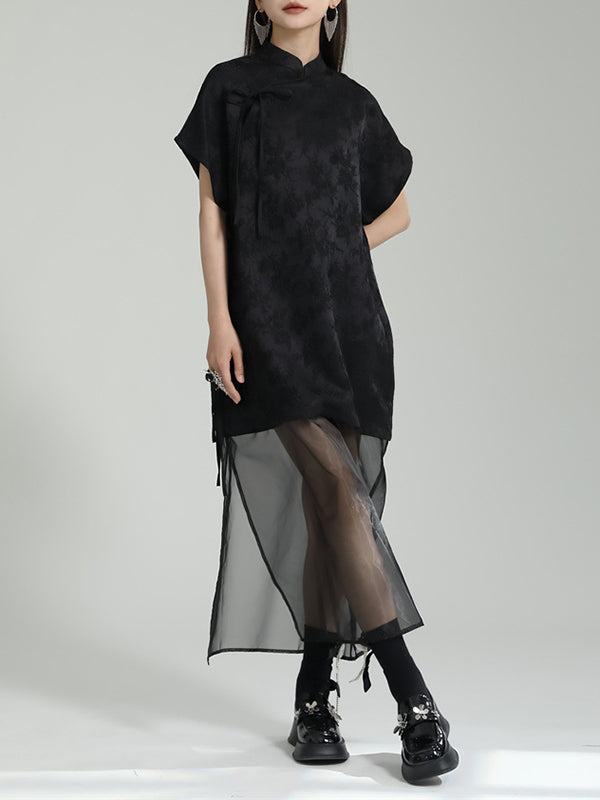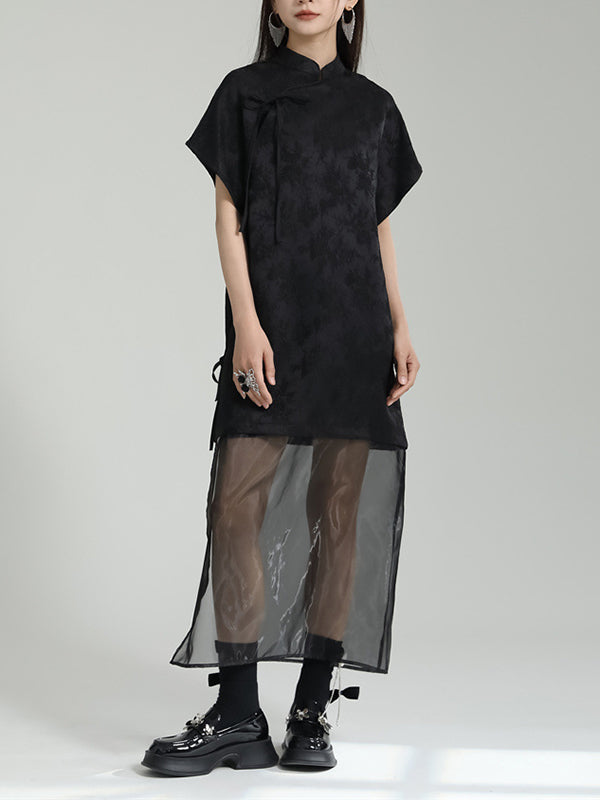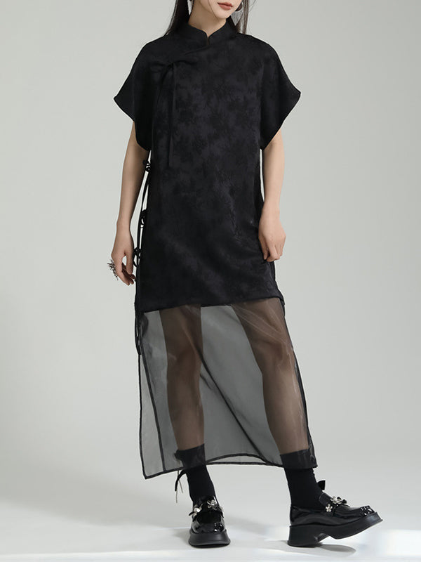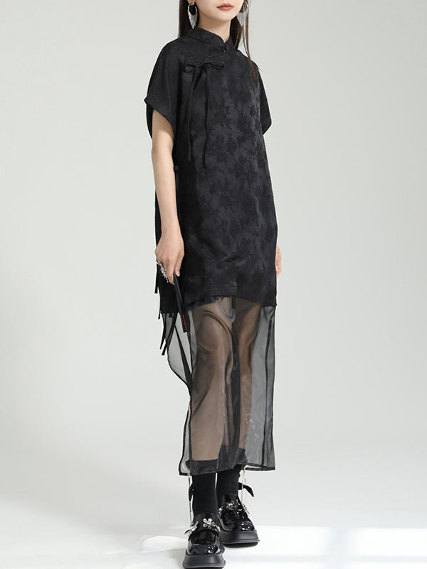 False Two Short Sleeves Gauze Jacquard Solid Color Stand Collar Long Cheongsams Midi Dresses