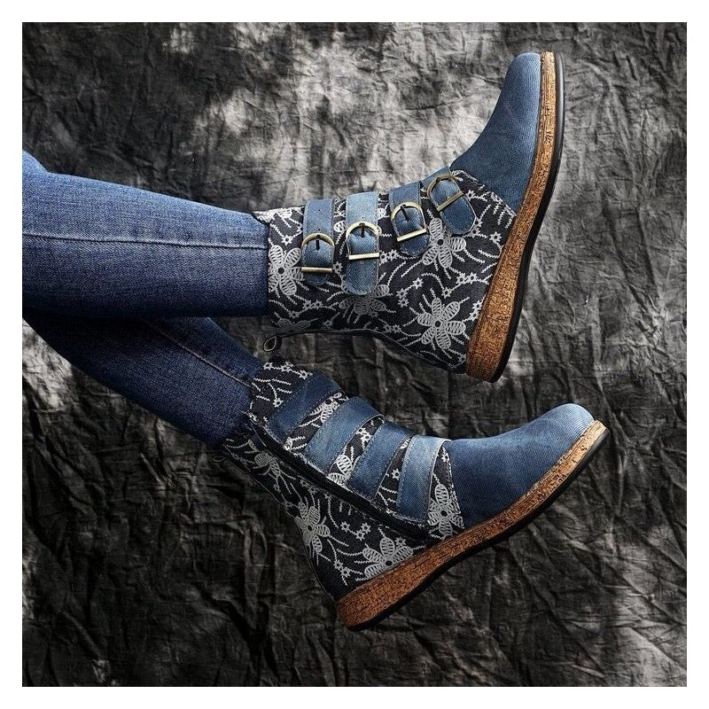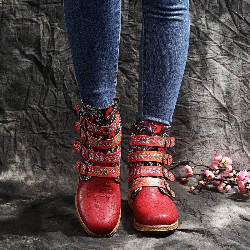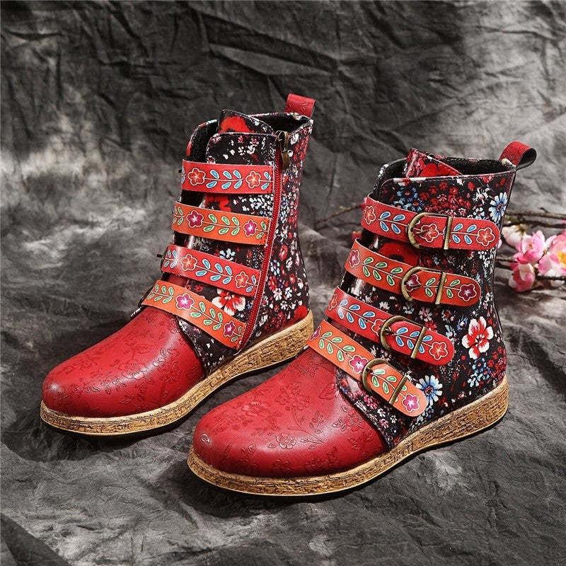 Fashionable Embroidered Flat Leather Belt Buckle Short Boots