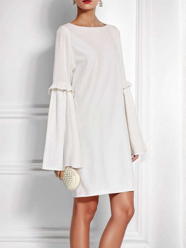 Flared Sleeves Long Sleeves Pleated Solid Color Split-Joint Round-Neck Mini Dresses