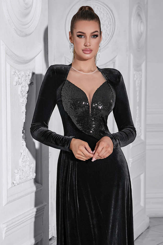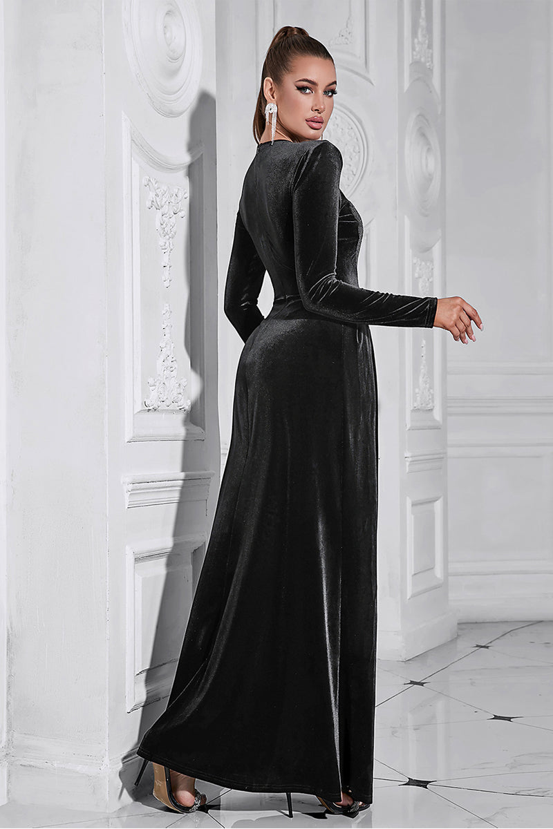 Elevate your elegance with this long-sleeve evening dress, combining timeless charm and contemporary details. The round neckline enhances sophistication, while the expertly crafted fabric blend creates a flowing, figure-flattering silhouette. The subtle stitching and seamless design transitions into a floor-length gown that exudes class and poise.