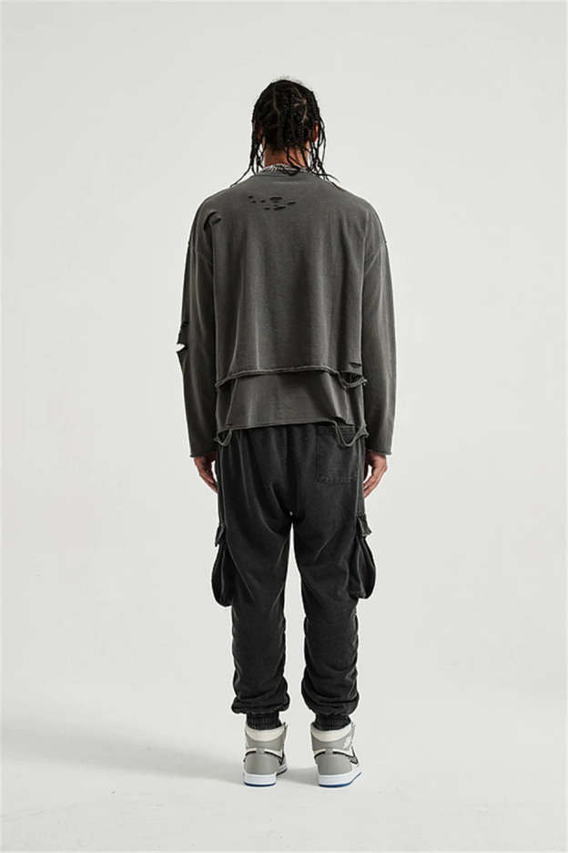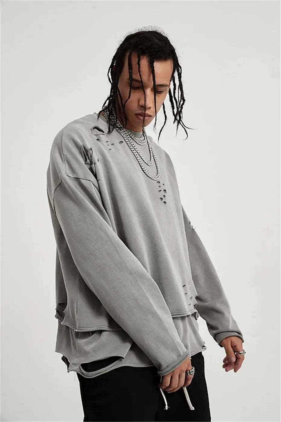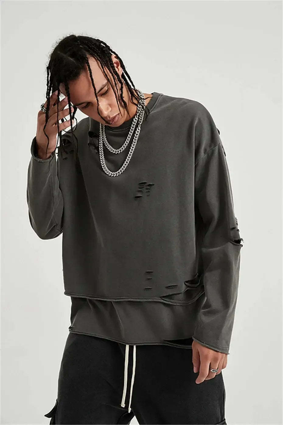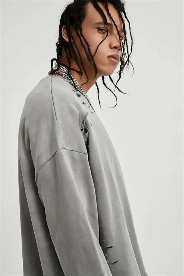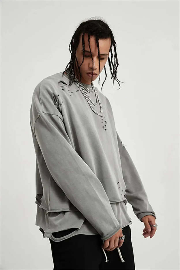Raw edges, rips, and layered cuts bring rebellious detail to this oversized sweatshirt. A must-have piece for grunge fits and off-duty streetwear, this sweatshirt brings effortless edge.