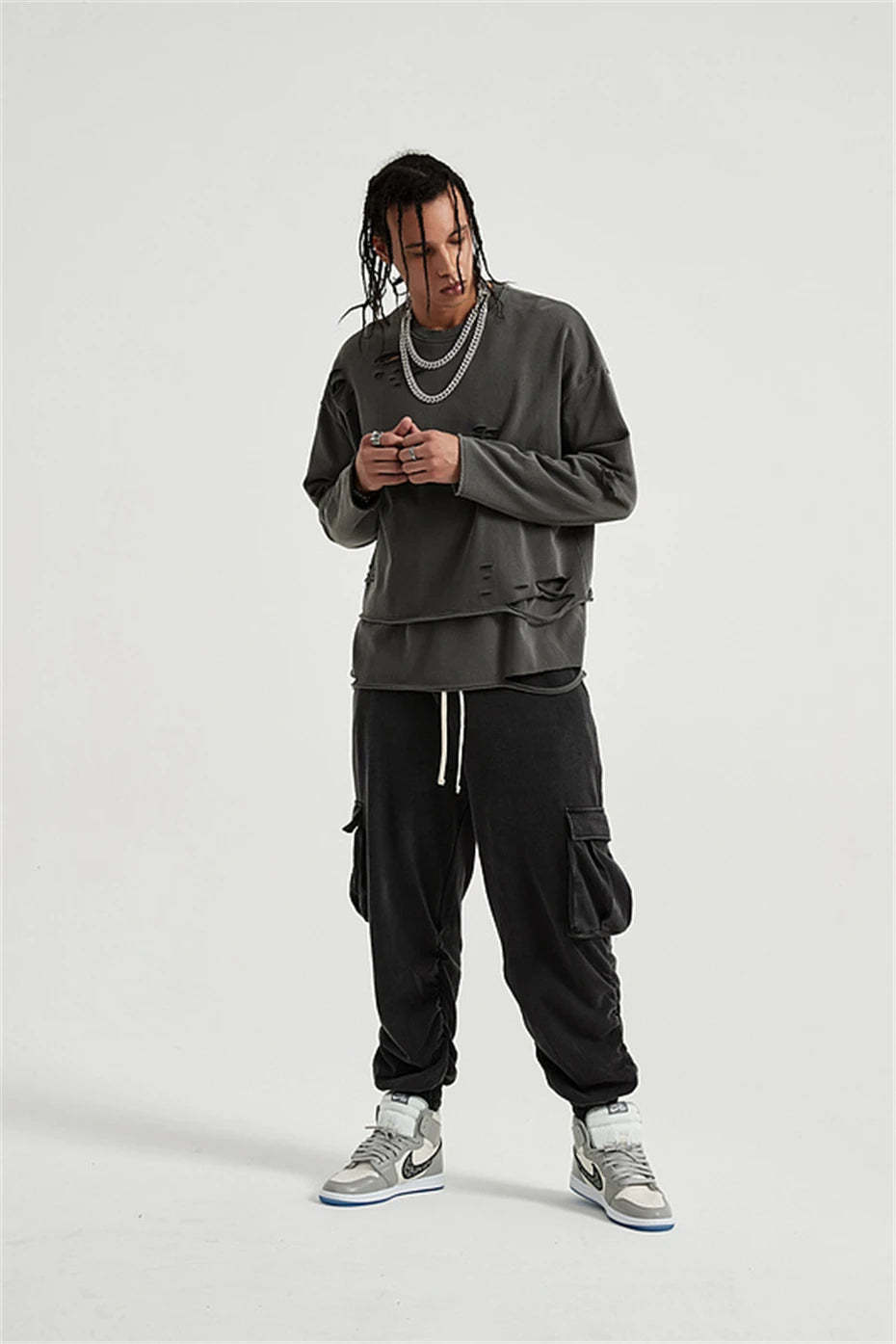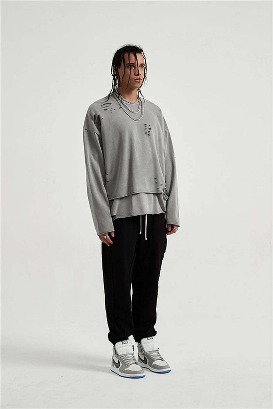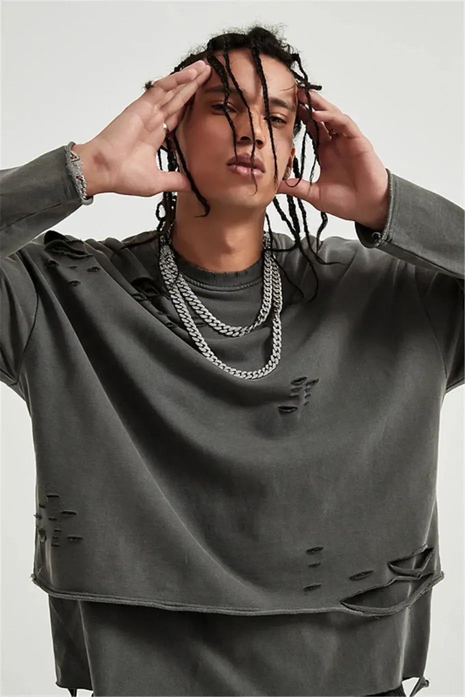 Raw edges, rips, and layered cuts bring rebellious detail to this oversized sweatshirt. A must-have piece for grunge fits and off-duty streetwear, this sweatshirt brings effortless edge.
