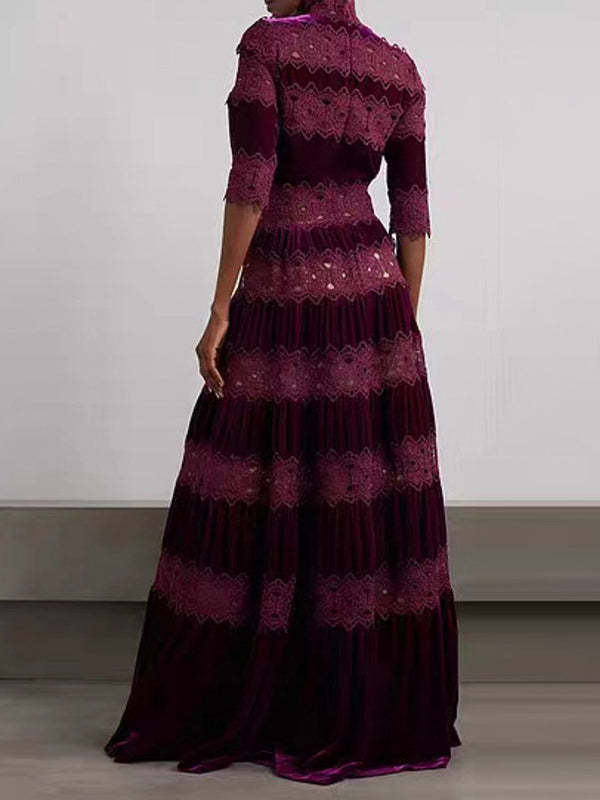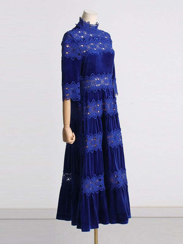 Half Sleeves High Waisted Embroidered Hollow Solid Color Split-Joint High Neck Maxi Dresses
