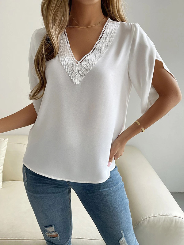 Half Sleeves Loose Hollow Split-Joint V-Neck Blouses&Shirts Tops