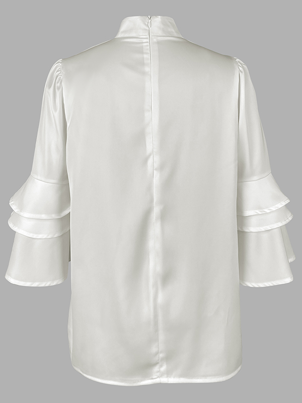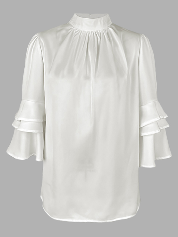 Half Sleeves Loose Layered Pleated Solid Color Split-Joint Mock Neck Blouses&Shirts Tops