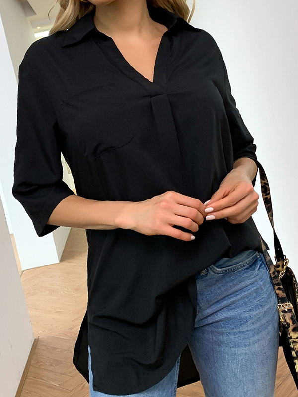 Half Sleeves Loose Pleated Solid Color Split-Joint Split-Side Lapel Blouses&Shirts Tops