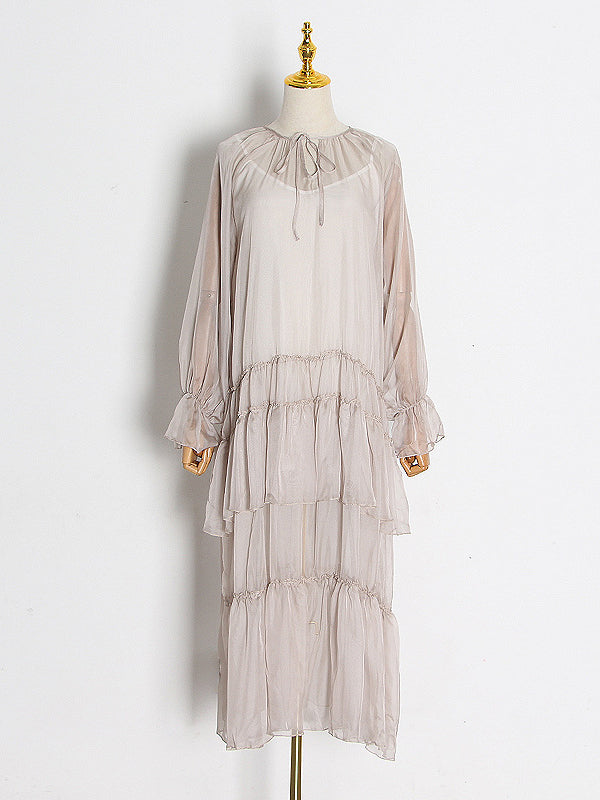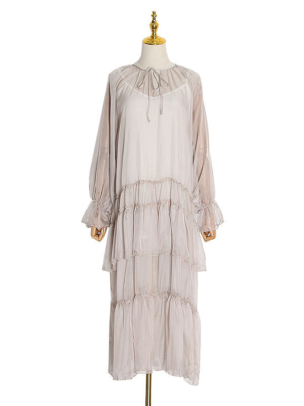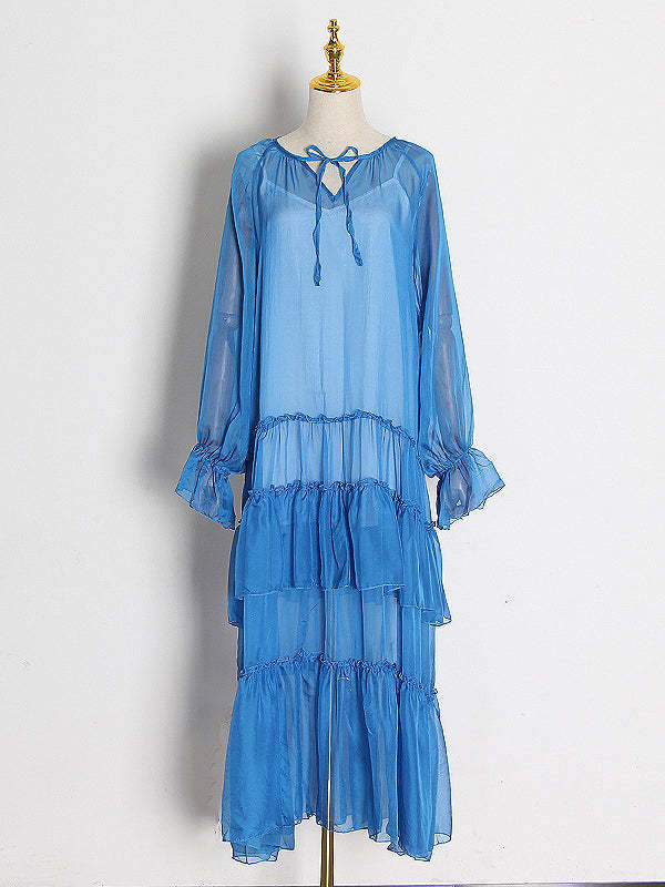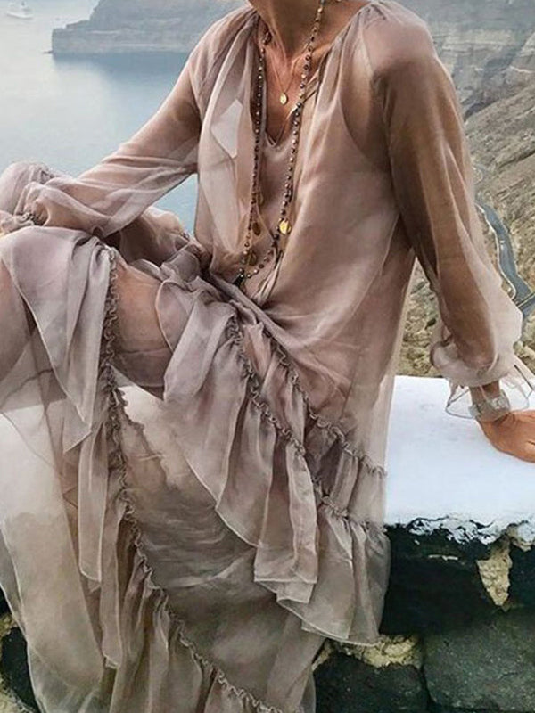 High Waisted Long Sleeves Elasticity Mesh Ruffled Solid Color Split-Joint V-Neck Inner Dress +Outer Maxi Dresses Two Pieces Set