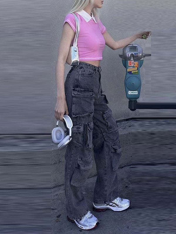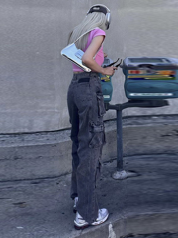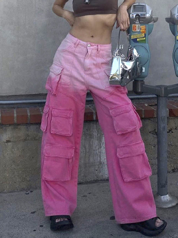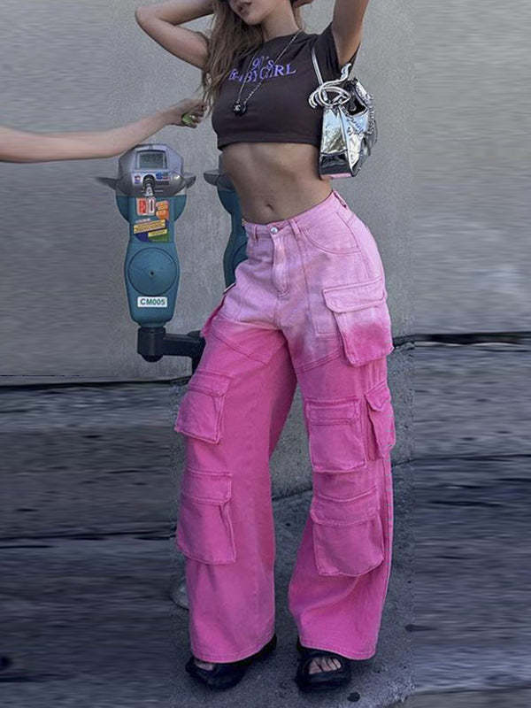 High Waisted Loose Gradient Pockets Split-Joint Jean Pants Bottoms