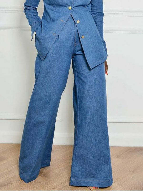 High Waisted Loose Pockets Solid Color Lapel Jean Pants Bottoms