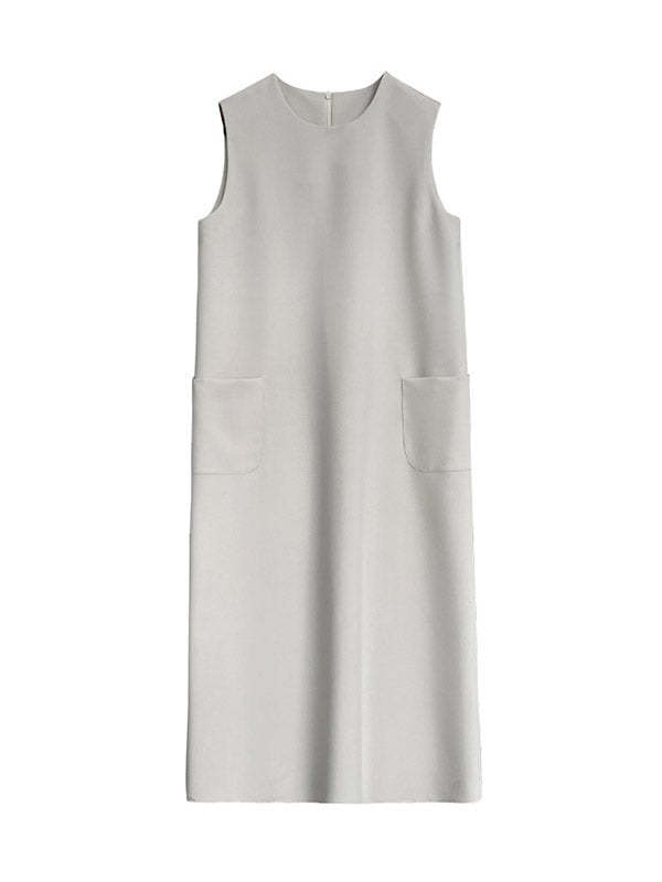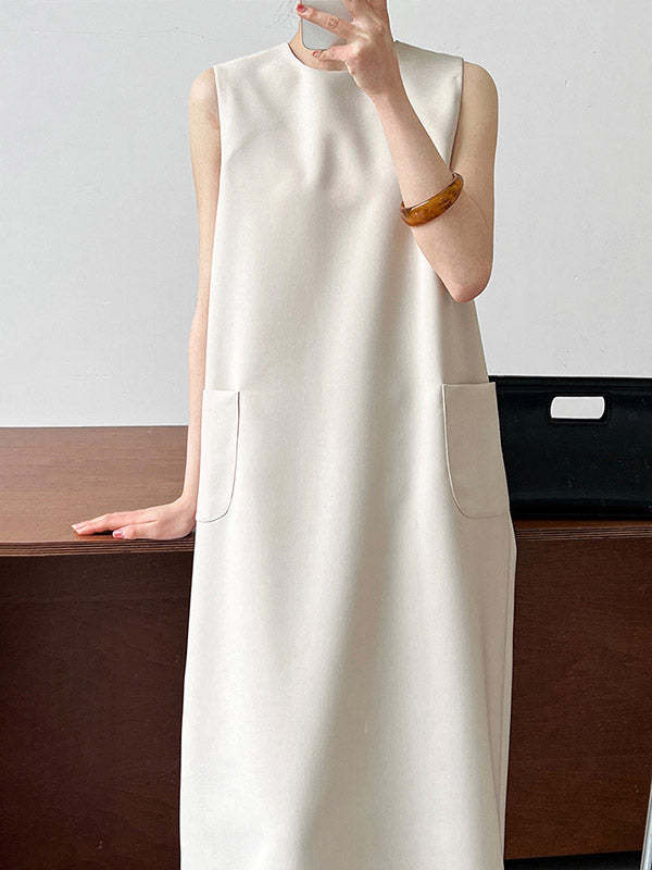 High Waisted Loose Pockets Solid Color Split-Back Zipper Round-Neck Midi Dresses