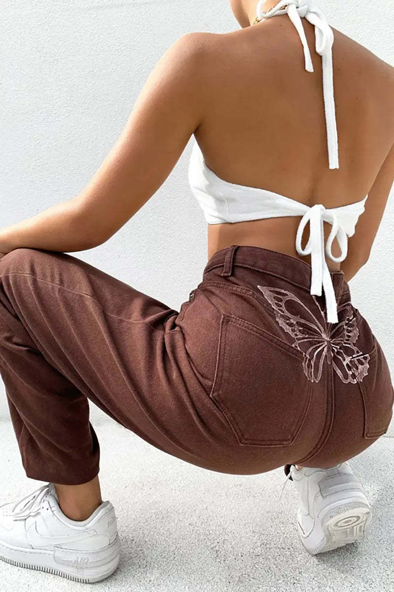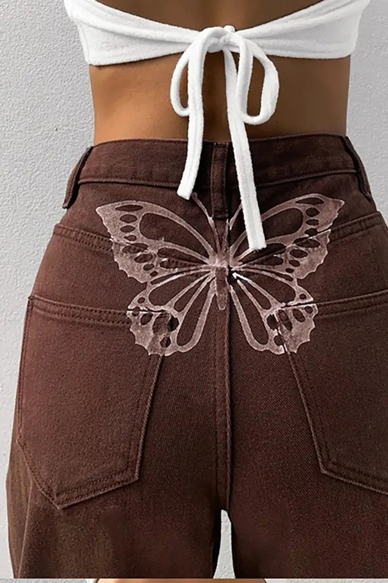 These high-waisted denim pants feature a unique printed design, blending classic denim with contemporary artistry. The printed patterns add a bold touch to the traditional denim look, making them a statement piece for any wardrobe. The high-waisted fit enhances the silhouette and provides comfort throughout the day.