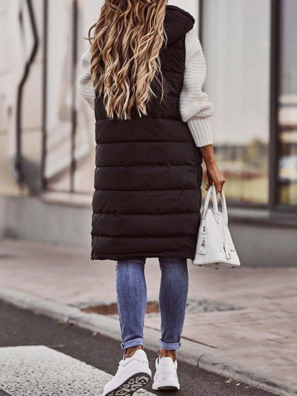 Hooded Sleeveless Buttoned Drawstring Keep Warm Solid Color Split-Joint Zipper Padded Coat Vest Outerwear