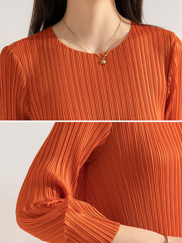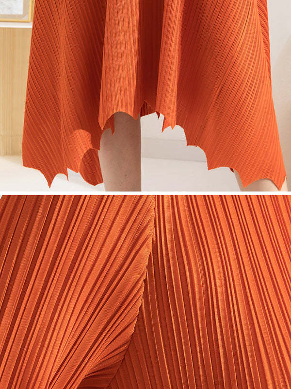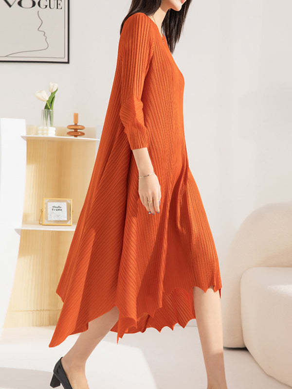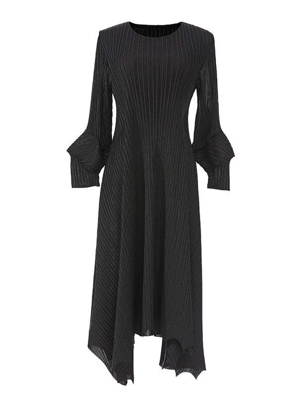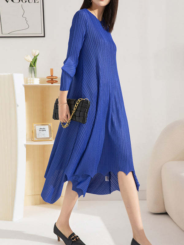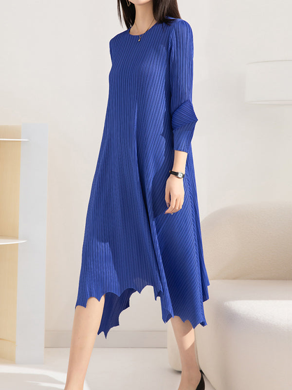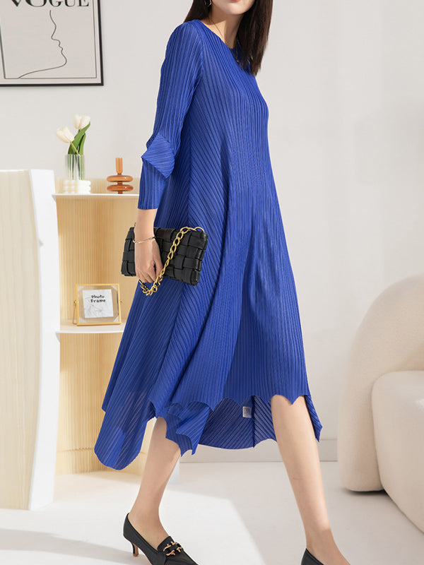 Irregular Clipping Loose Pleated Solid Color Round-Neck Midi Dresses
