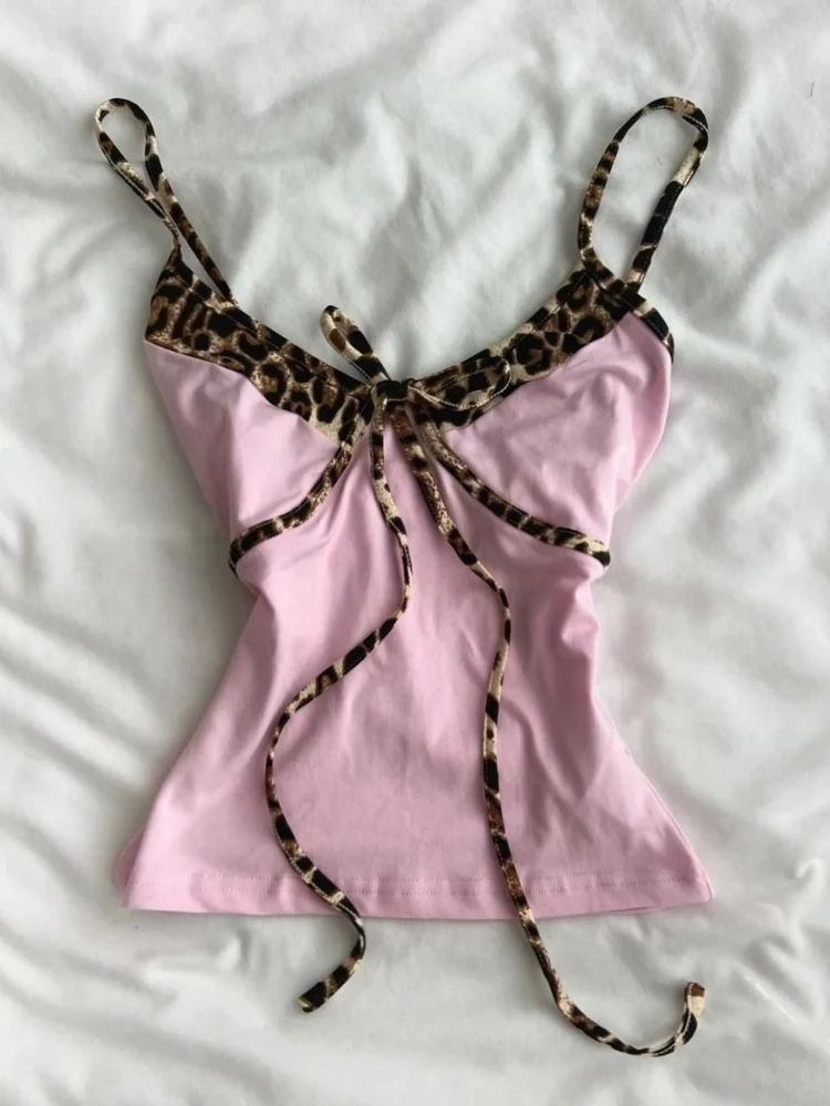 KYLETHOMASW - Aesthetic Vintage Skinny Patchwork Sling Tops Women Design Sexy Leopard Print Lace Up Vest Female Hot Girl Slim Pink Short Top