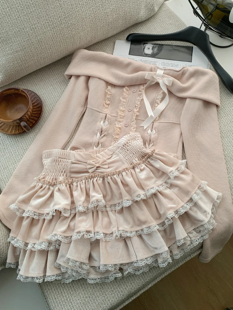 KYLETHOMASW - Autumn Winter New Two Piece Set Kawaii Bow Off Shoulder Long Sleeve Tops + 2yk High Waist Ruched Cake Skirt Japanese Pink Suits