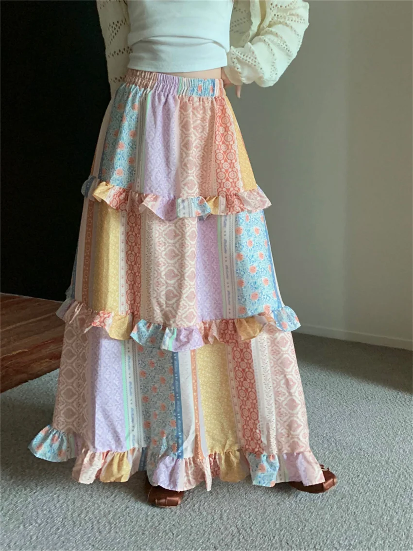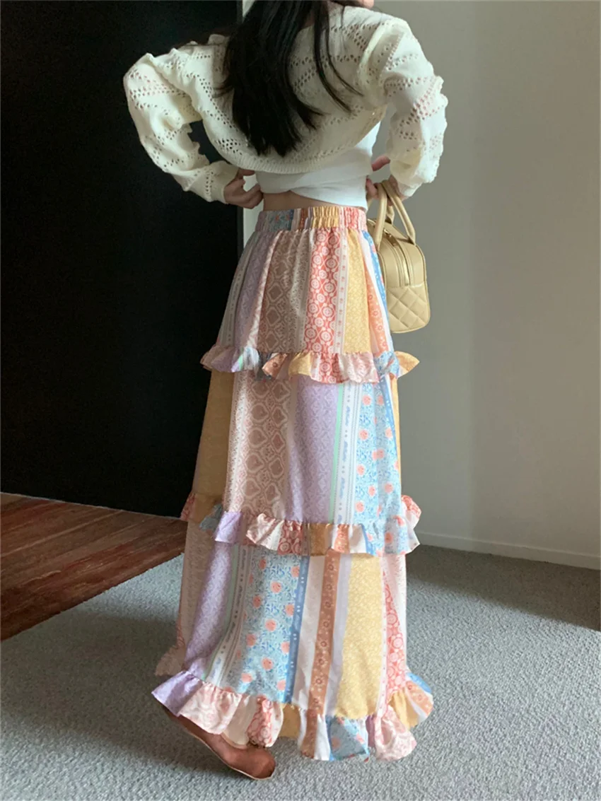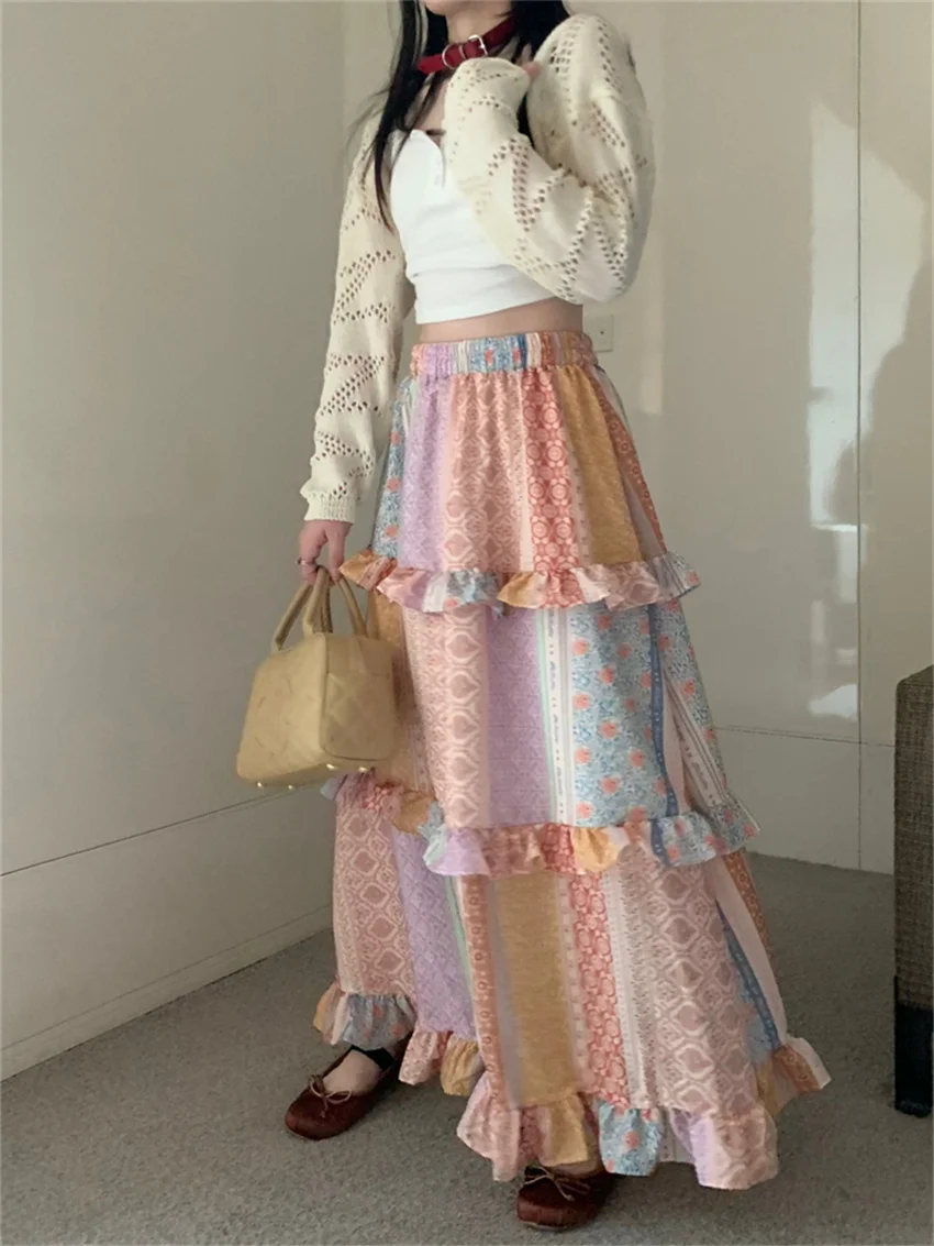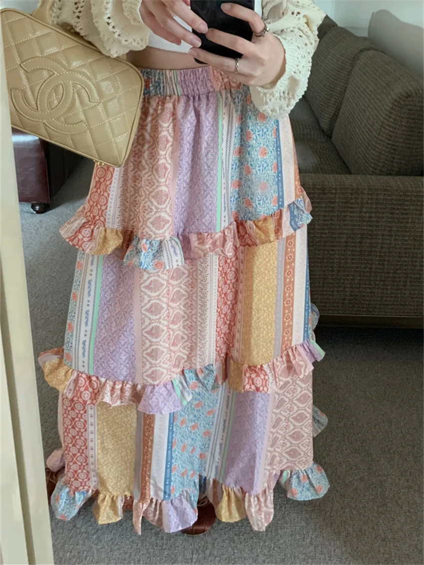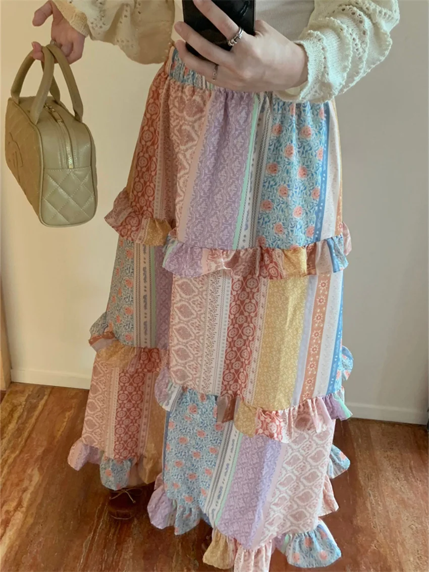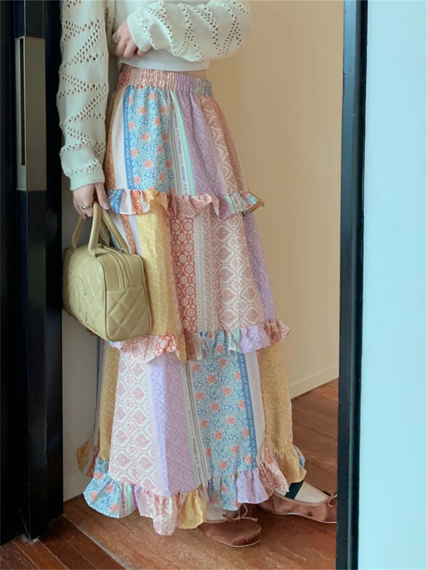 KYLETHOMASW - Cake Skirts Women A-Line Stylish Patchwork Printed Ruffles Autumn Chic Loose Gentle OL Vintage All Match Daily