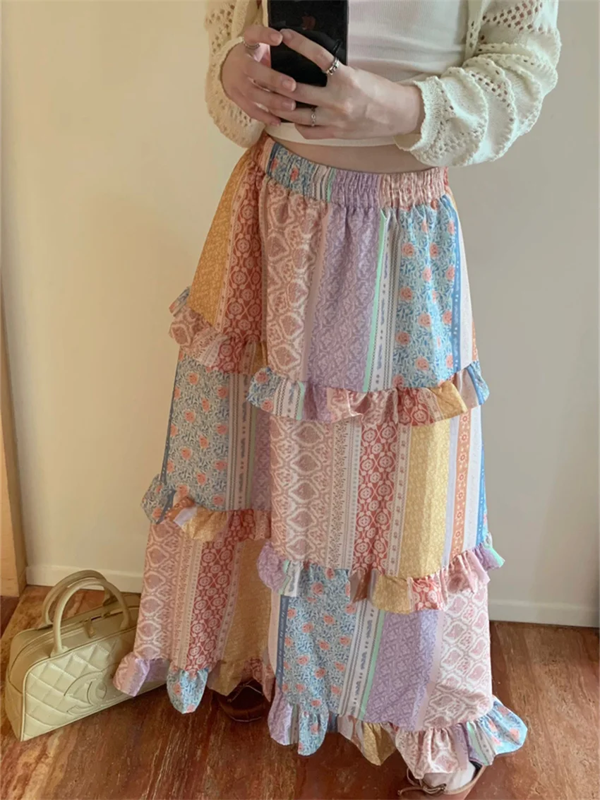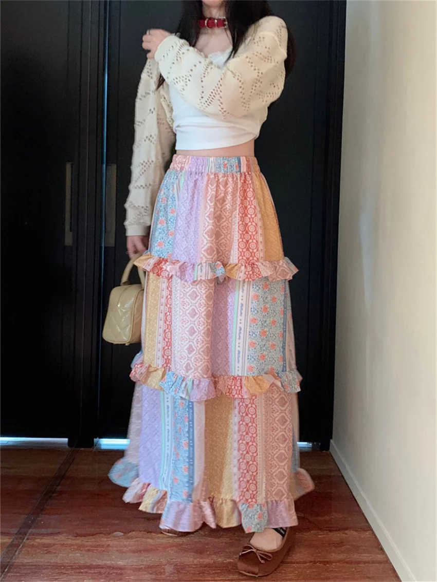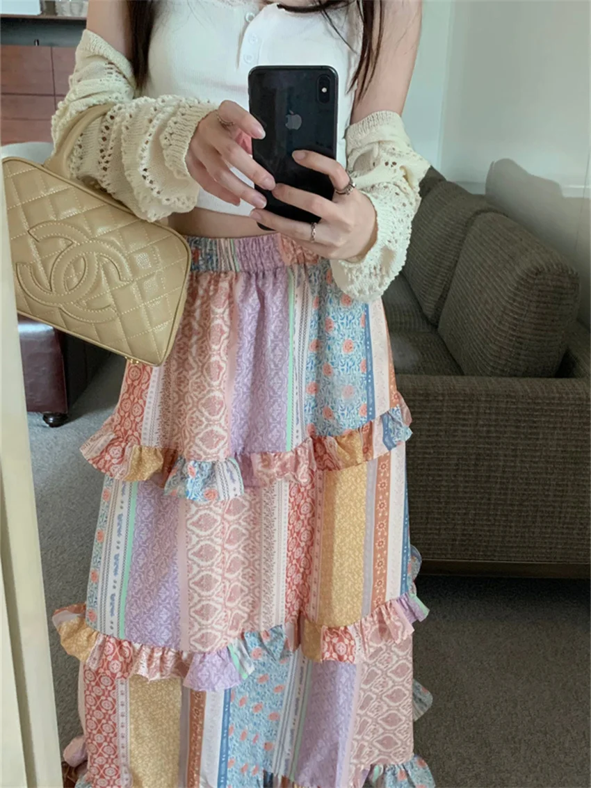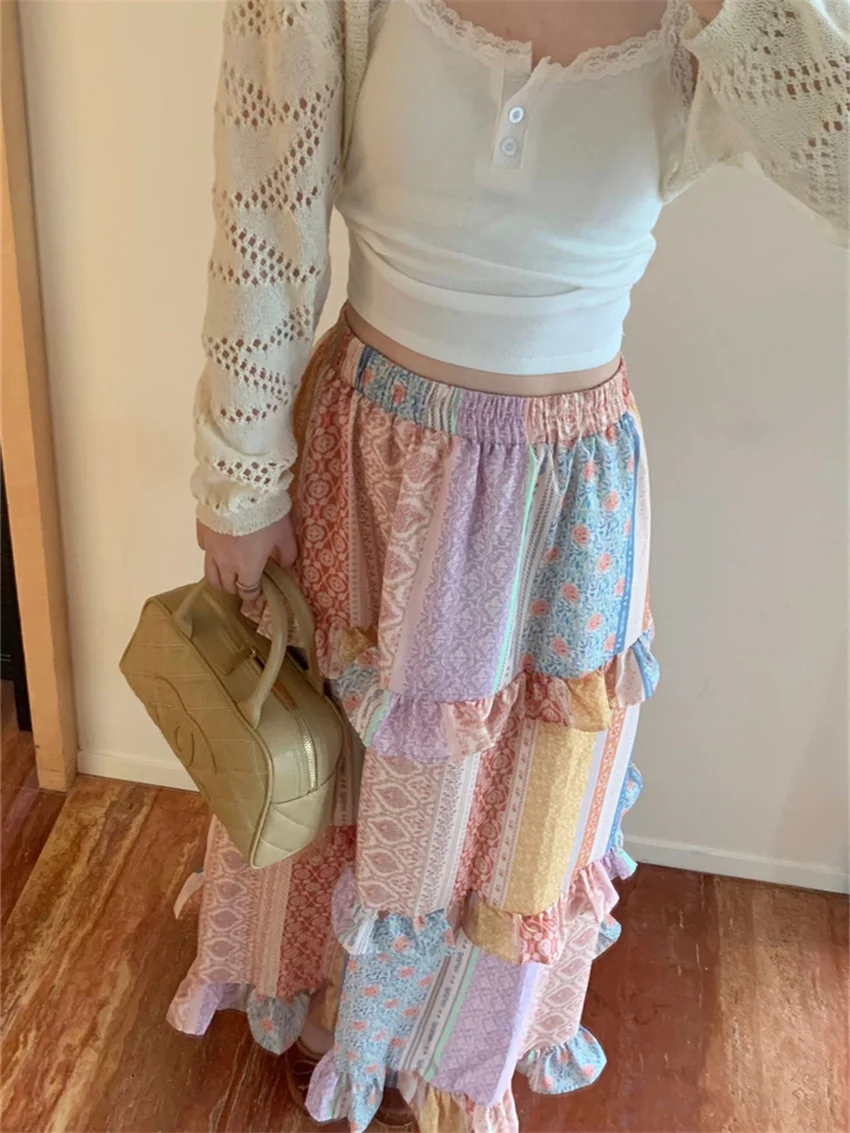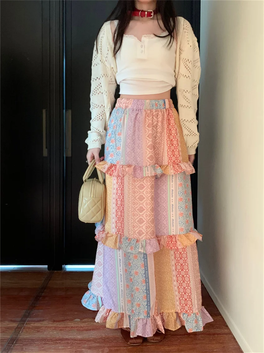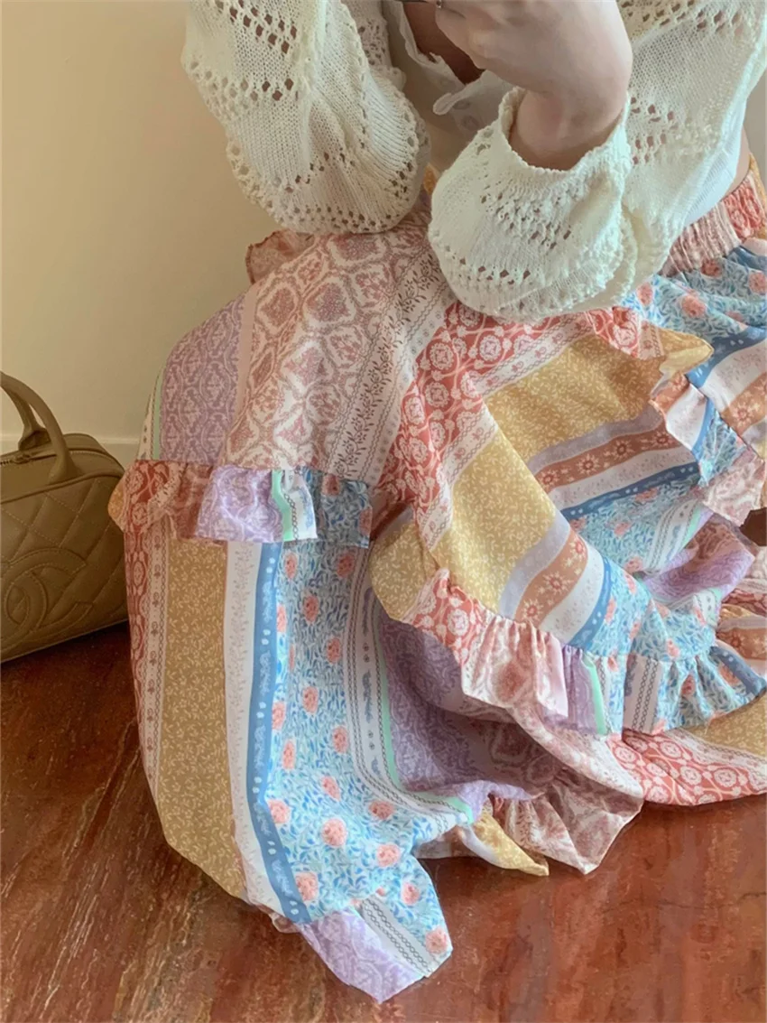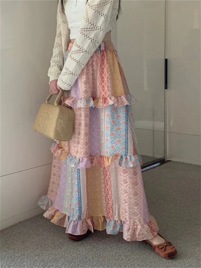 KYLETHOMASW - Cake Skirts Women A-Line Stylish Patchwork Printed Ruffles Autumn Chic Loose Gentle OL Vintage All Match Daily