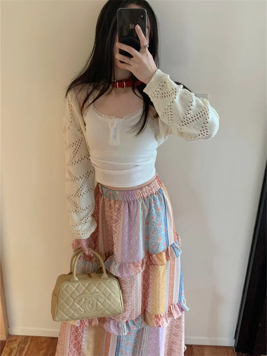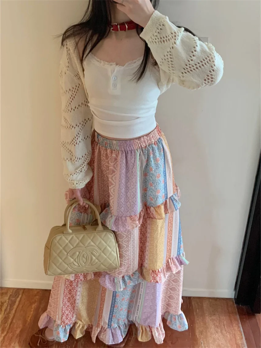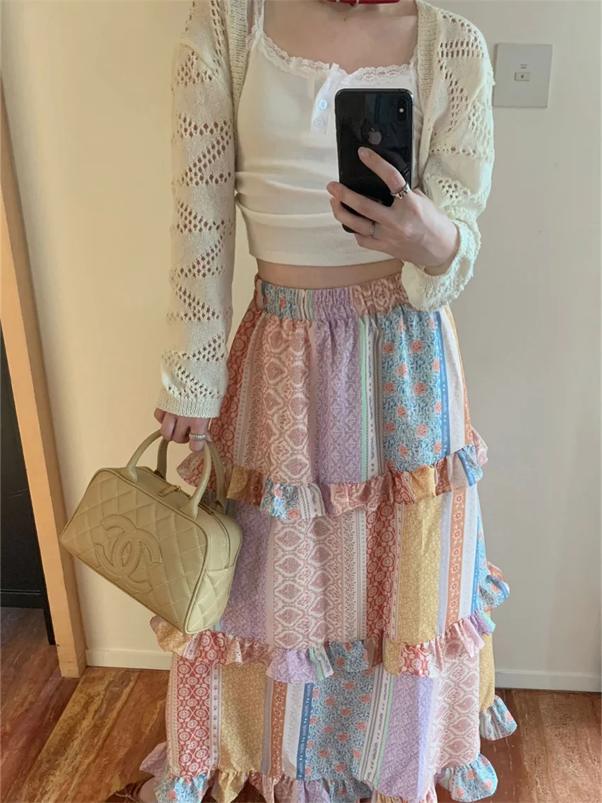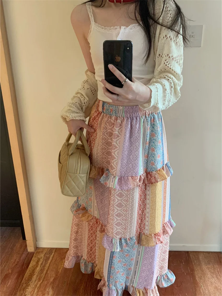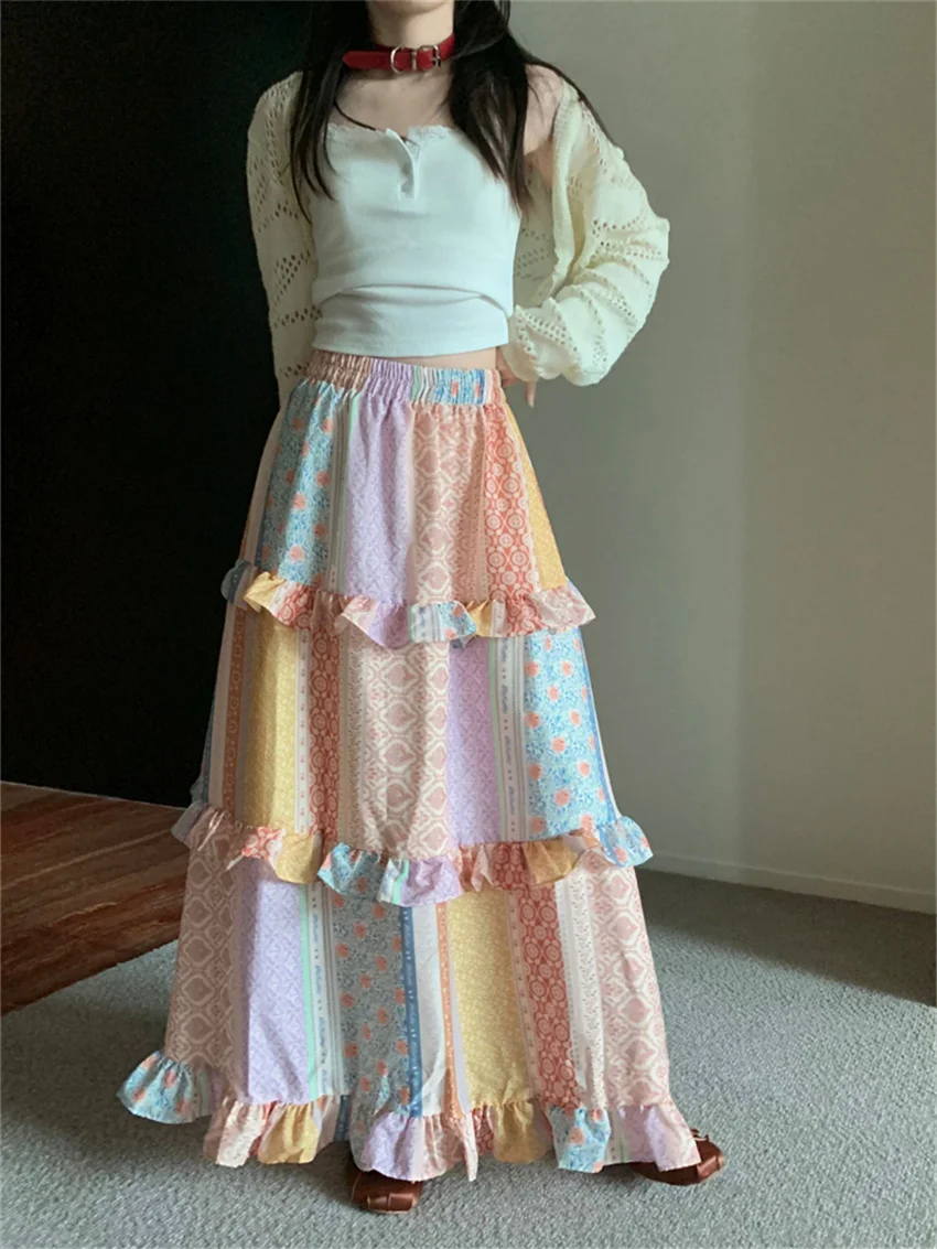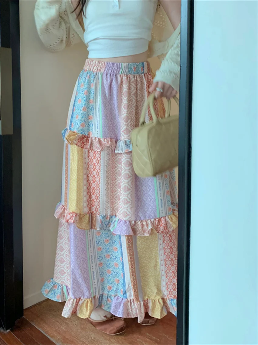 KYLETHOMASW - Cake Skirts Women A-Line Stylish Patchwork Printed Ruffles Autumn Chic Loose Gentle OL Vintage All Match Daily