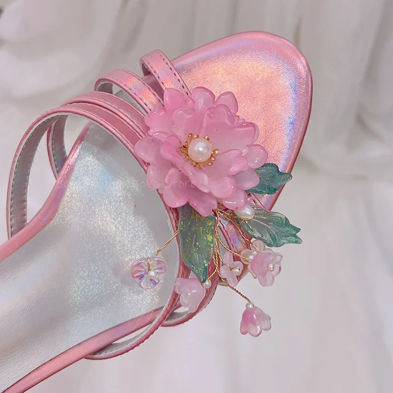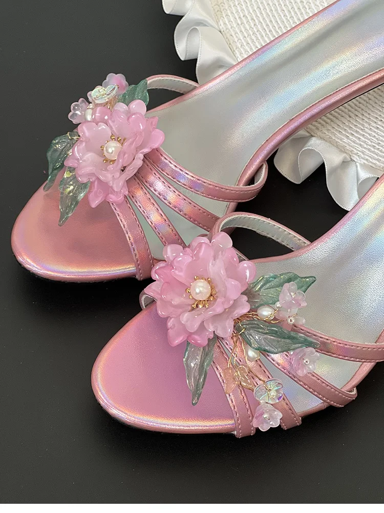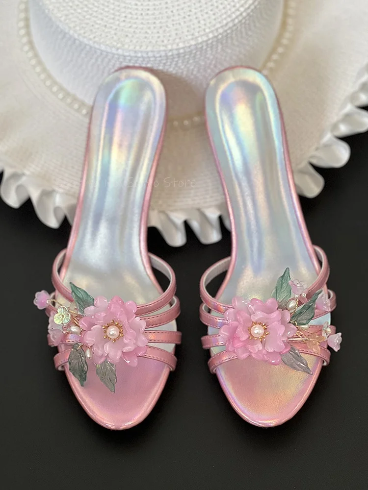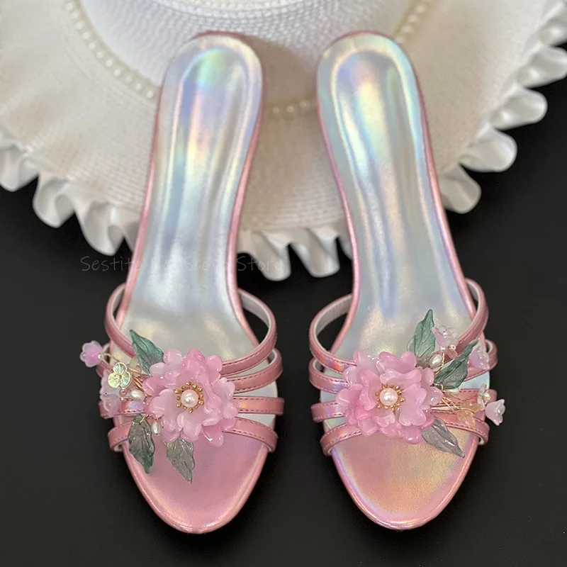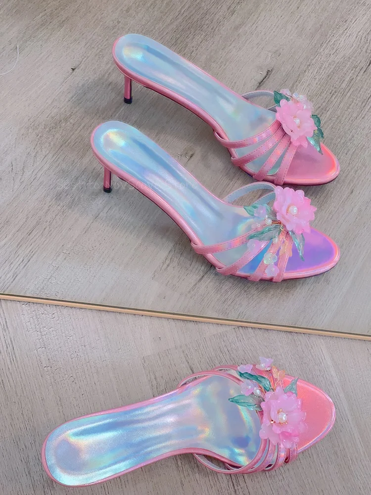 KYLETHOMASW - Colorful Leather Flower Mules Stiletto Heels Hollow Strappy Open Toe Slippers Slip On Summer Dress Daily Slippers Party Sandals