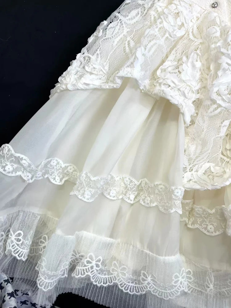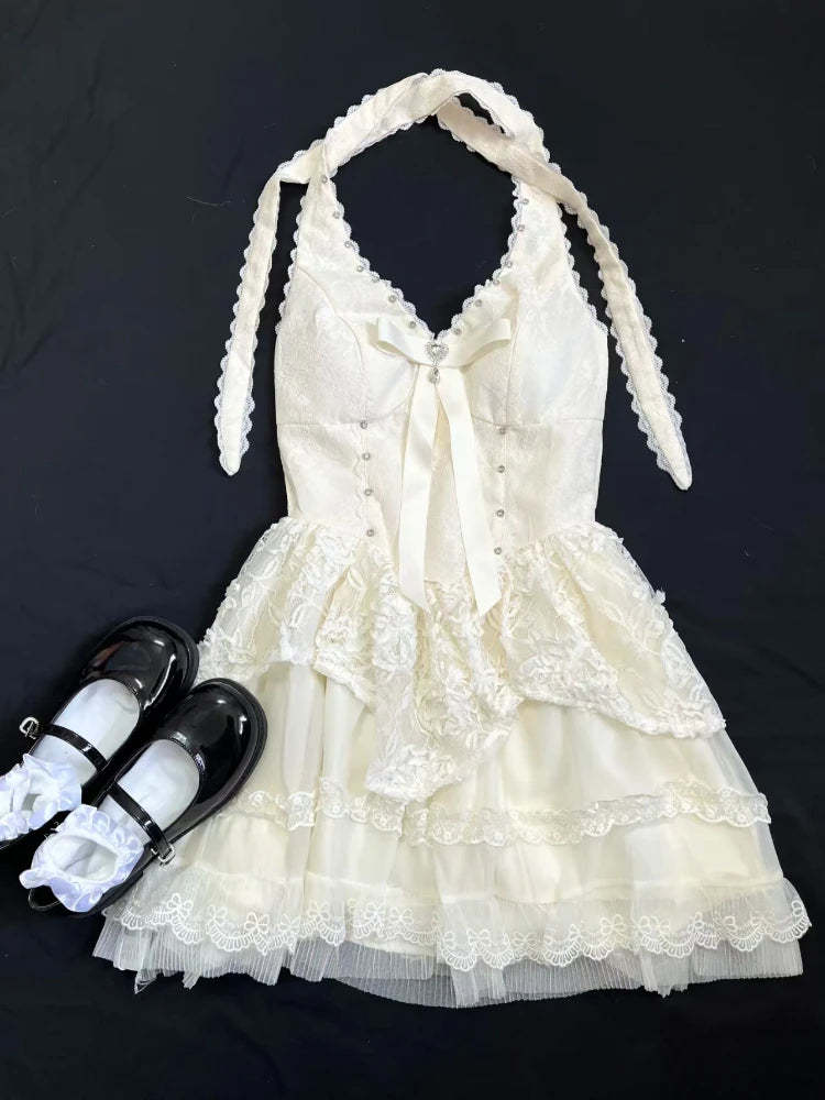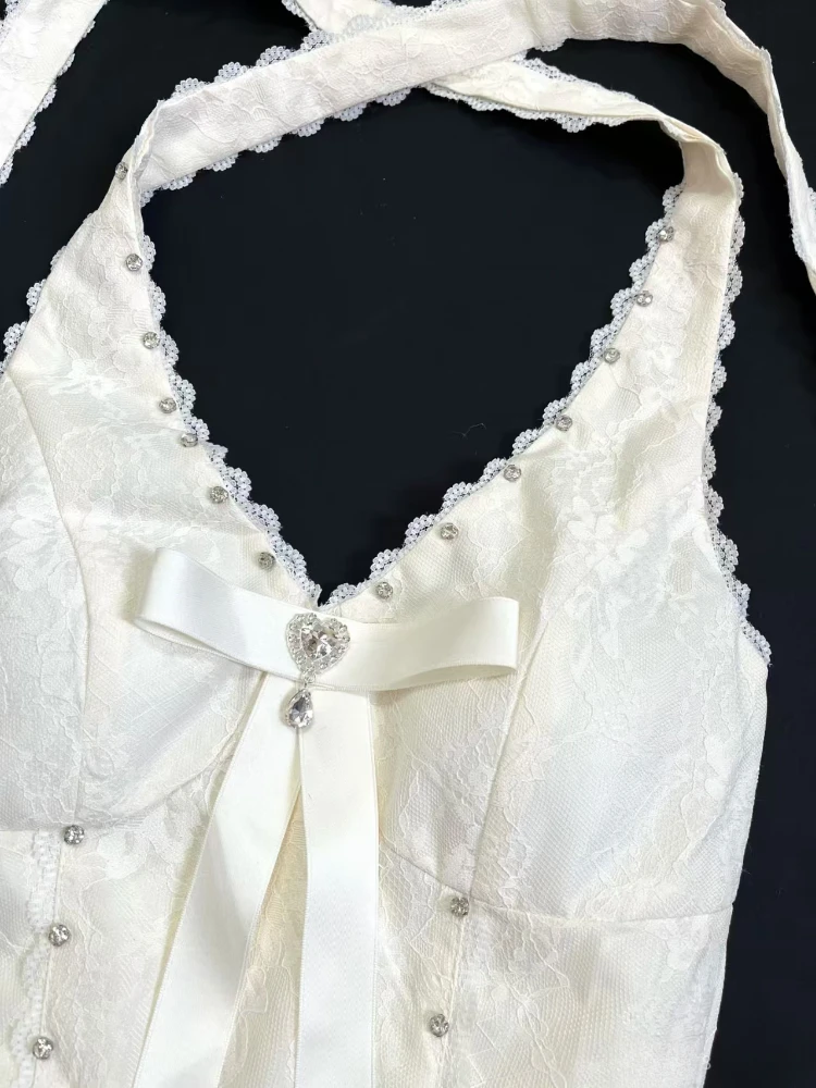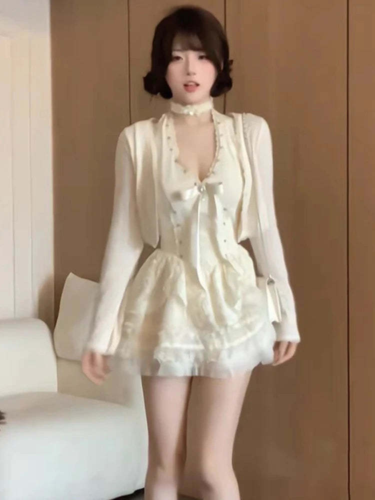KYLETHOMASW - Elegant Sweet Thin 2-piece Set Dress Women Design Chic Bow Slash Neck Sleeveless Lace Dresses Female Fashion Cute Solid Cardigan