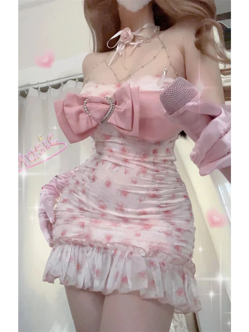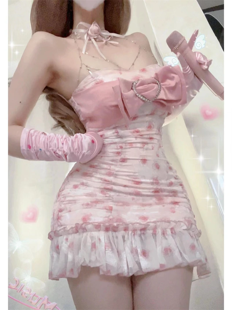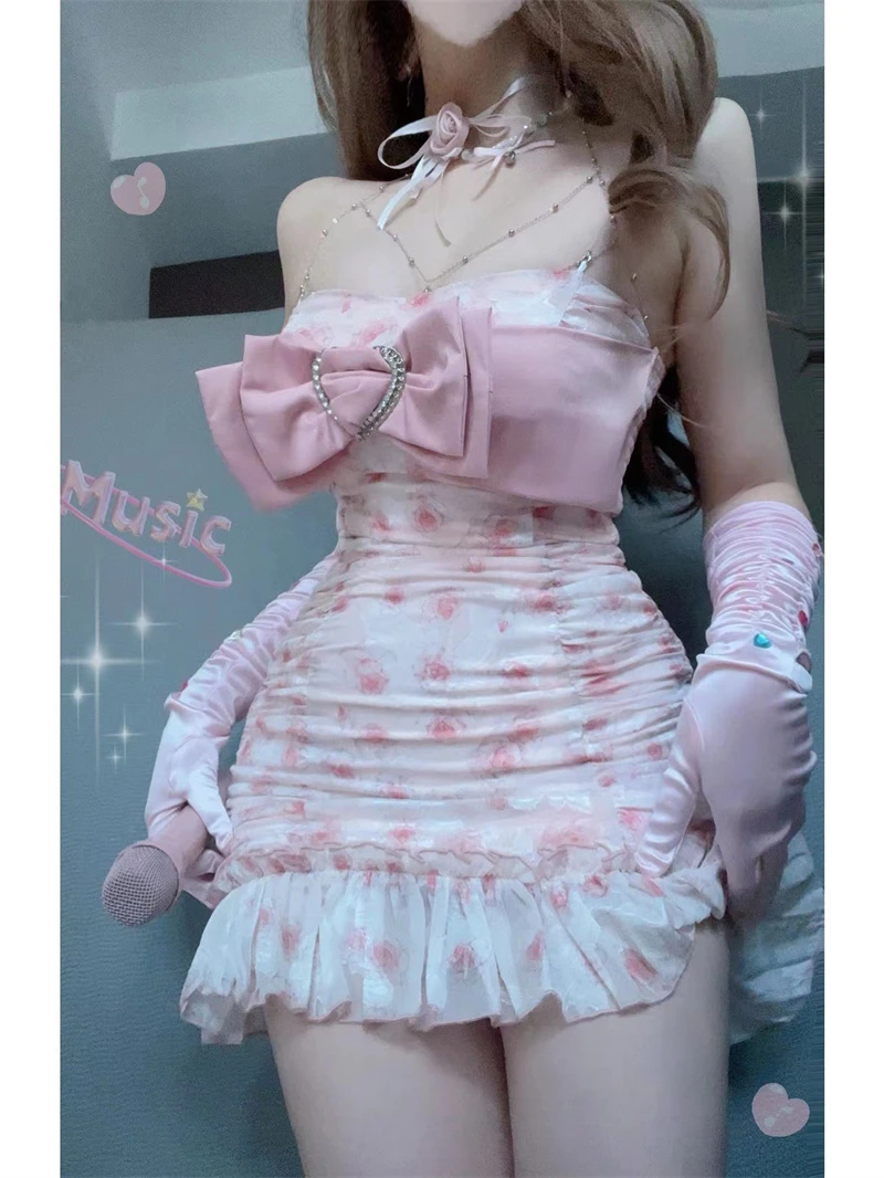 Kylethomasw French Elegance Pink Corset Dress Bow Fashion Party Prom Fairy Dress Chest Wrapping Sleeveless 2000s Aesthetic Sweet Streetwear