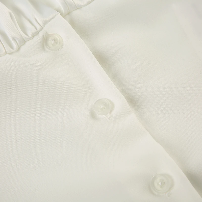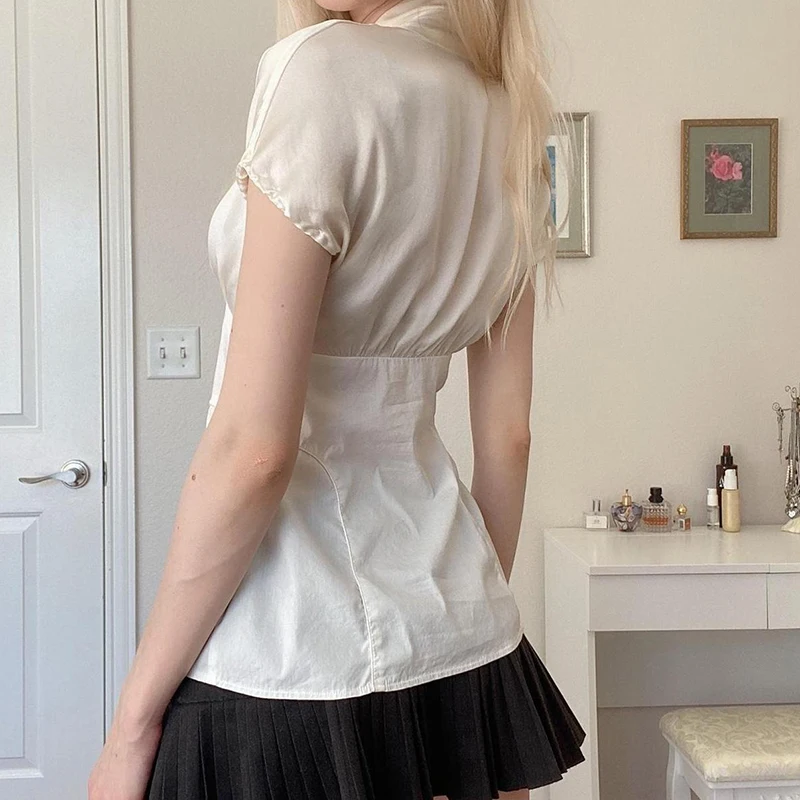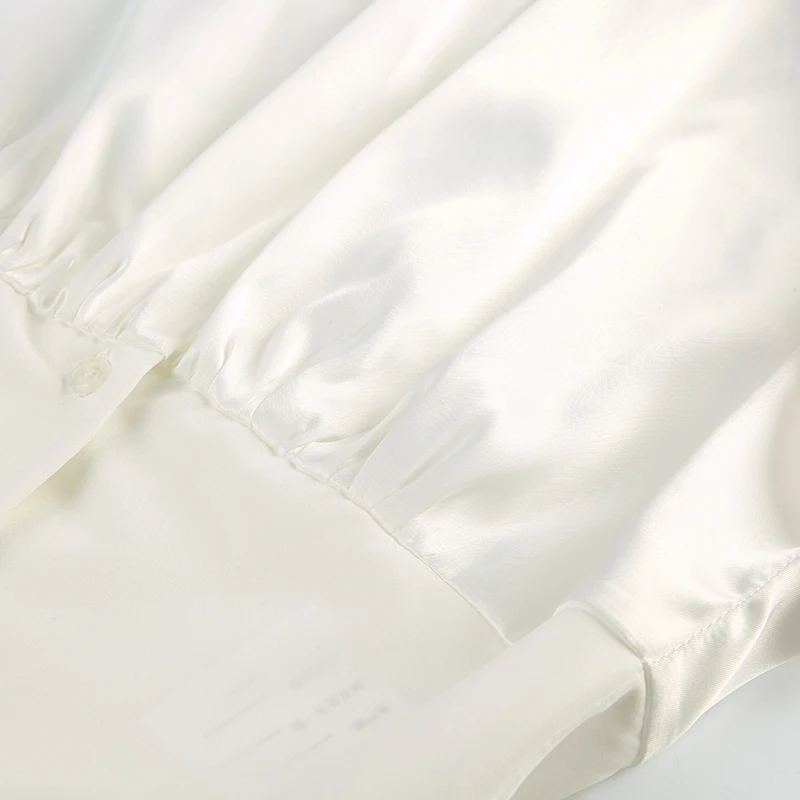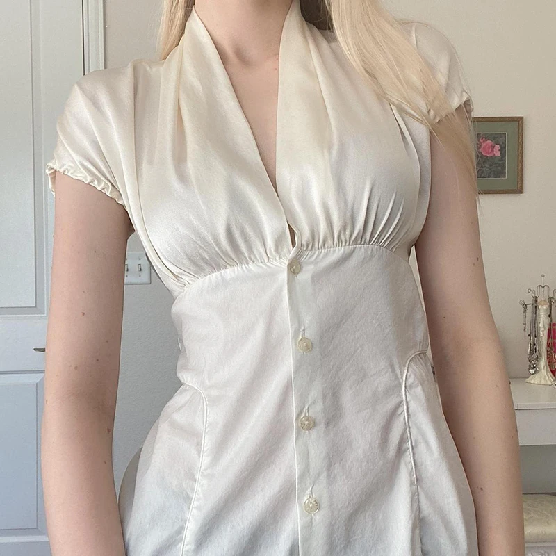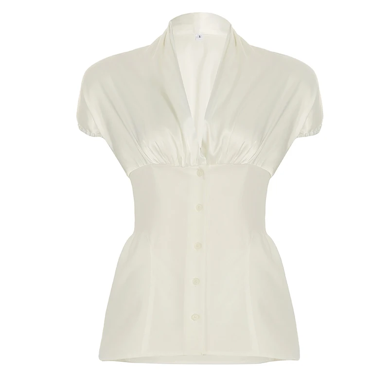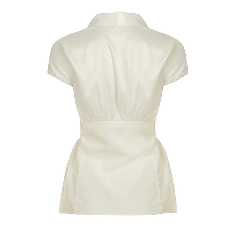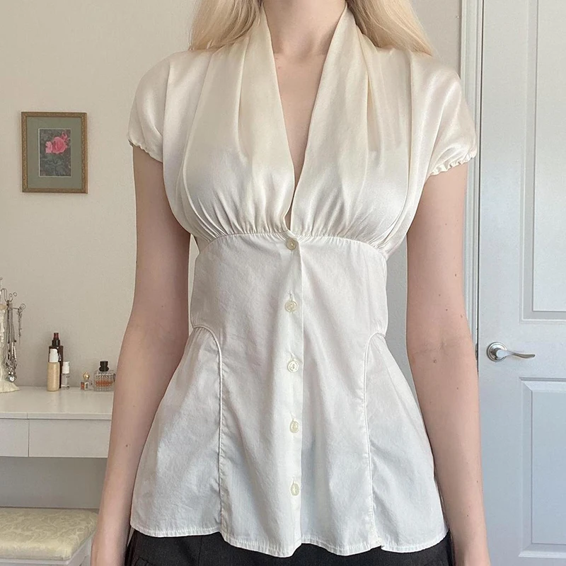 KYLETHOMASW - French Retro Satin A-line Shirt Chic Fashion Slimming Short Sleeve V-neck Blouses Office Ladies Elegant Top All-match