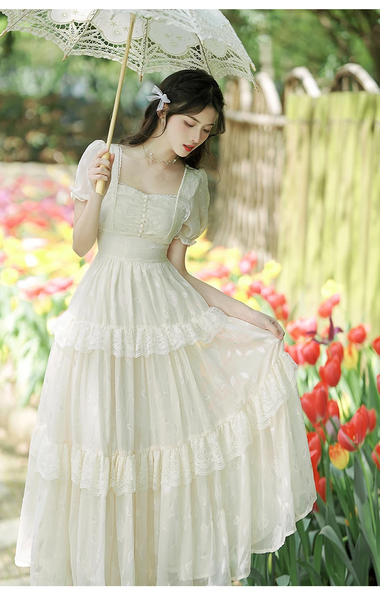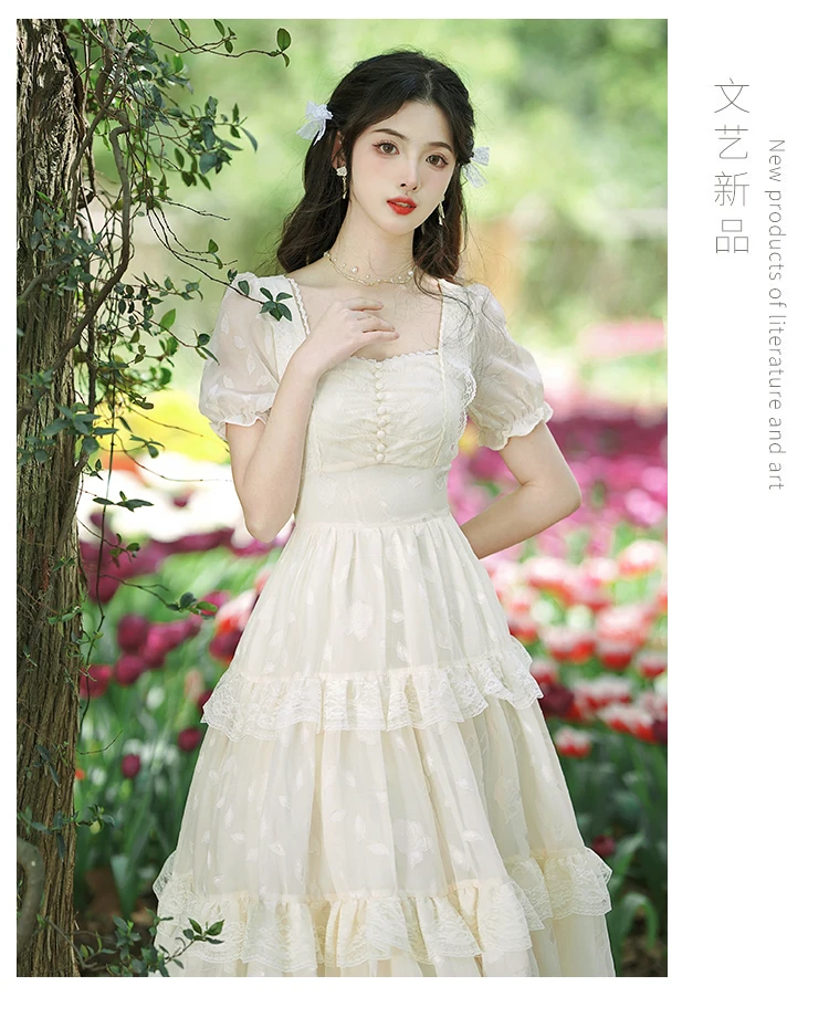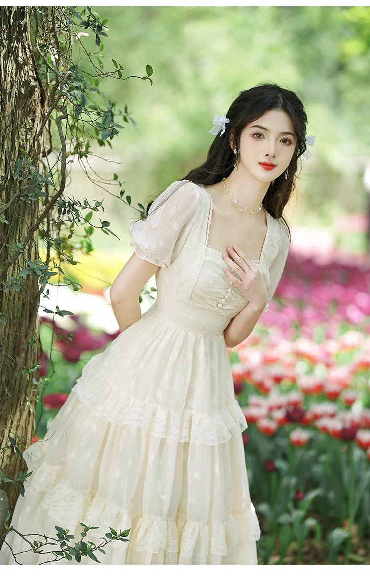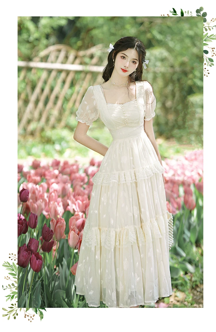 French Style Fairy Dresses for Women Apricot Square Neck Lace Embroidery Mesh Dress Short Sleeve Lady Retro Elegant Robe Vestido