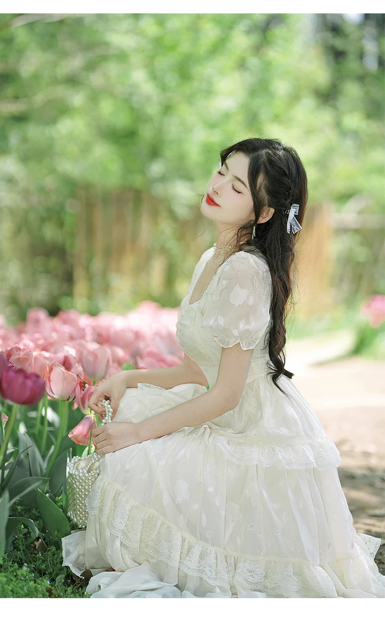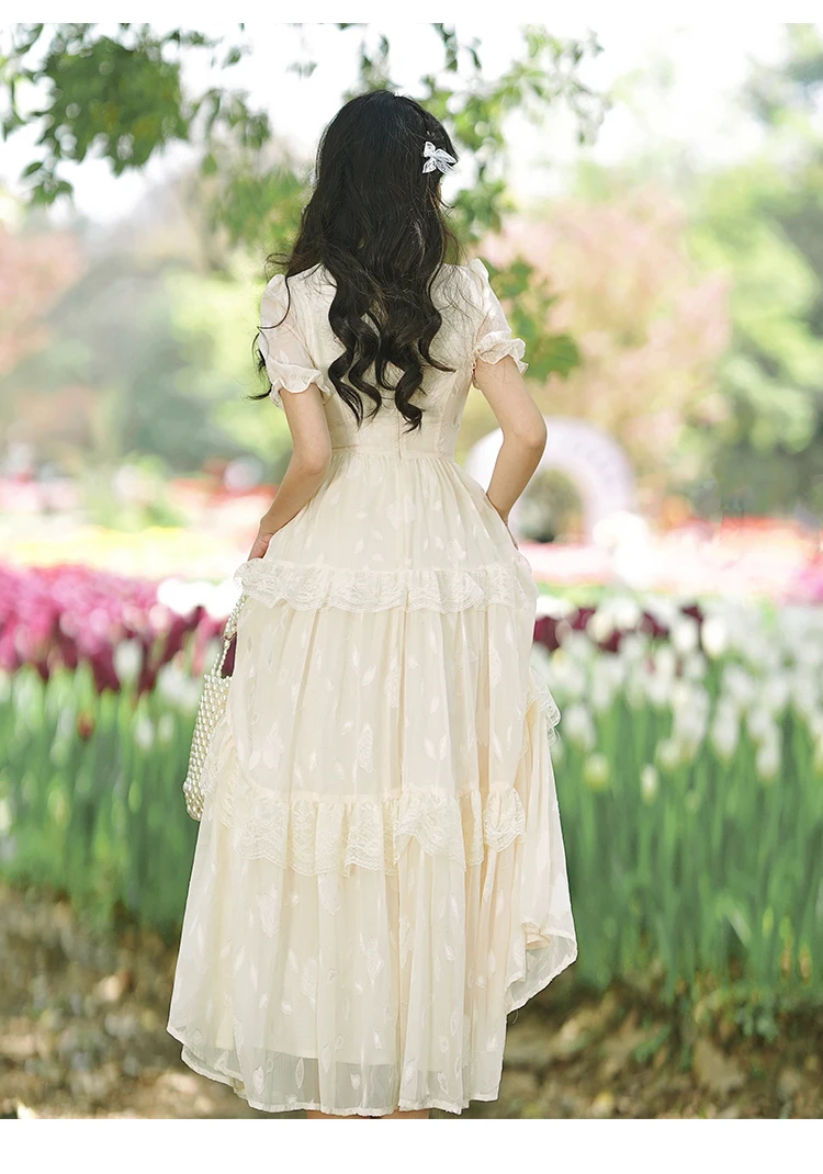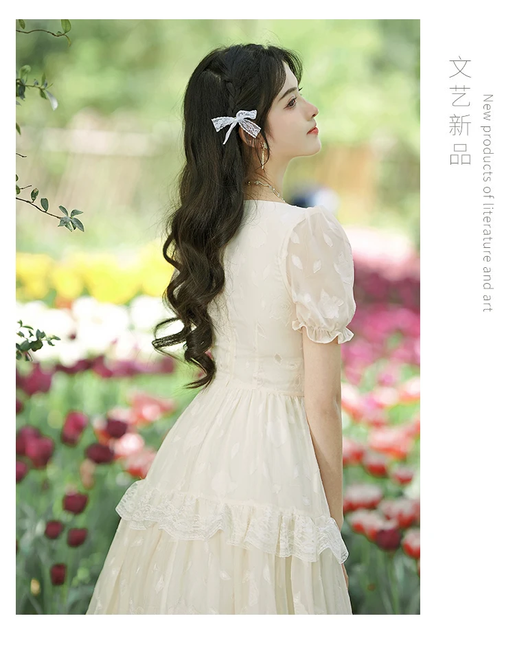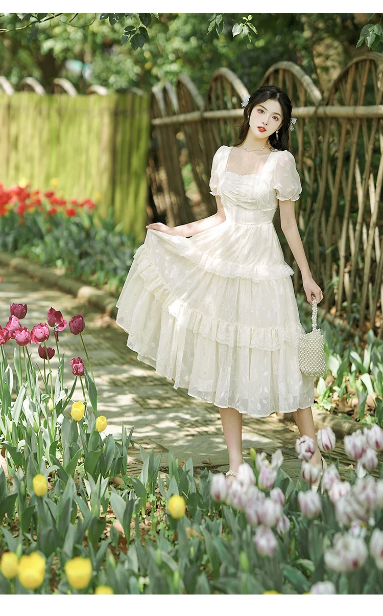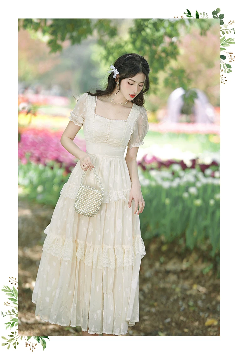 French Style Fairy Dresses for Women Apricot Square Neck Lace Embroidery Mesh Dress Short Sleeve Lady Retro Elegant Robe Vestido