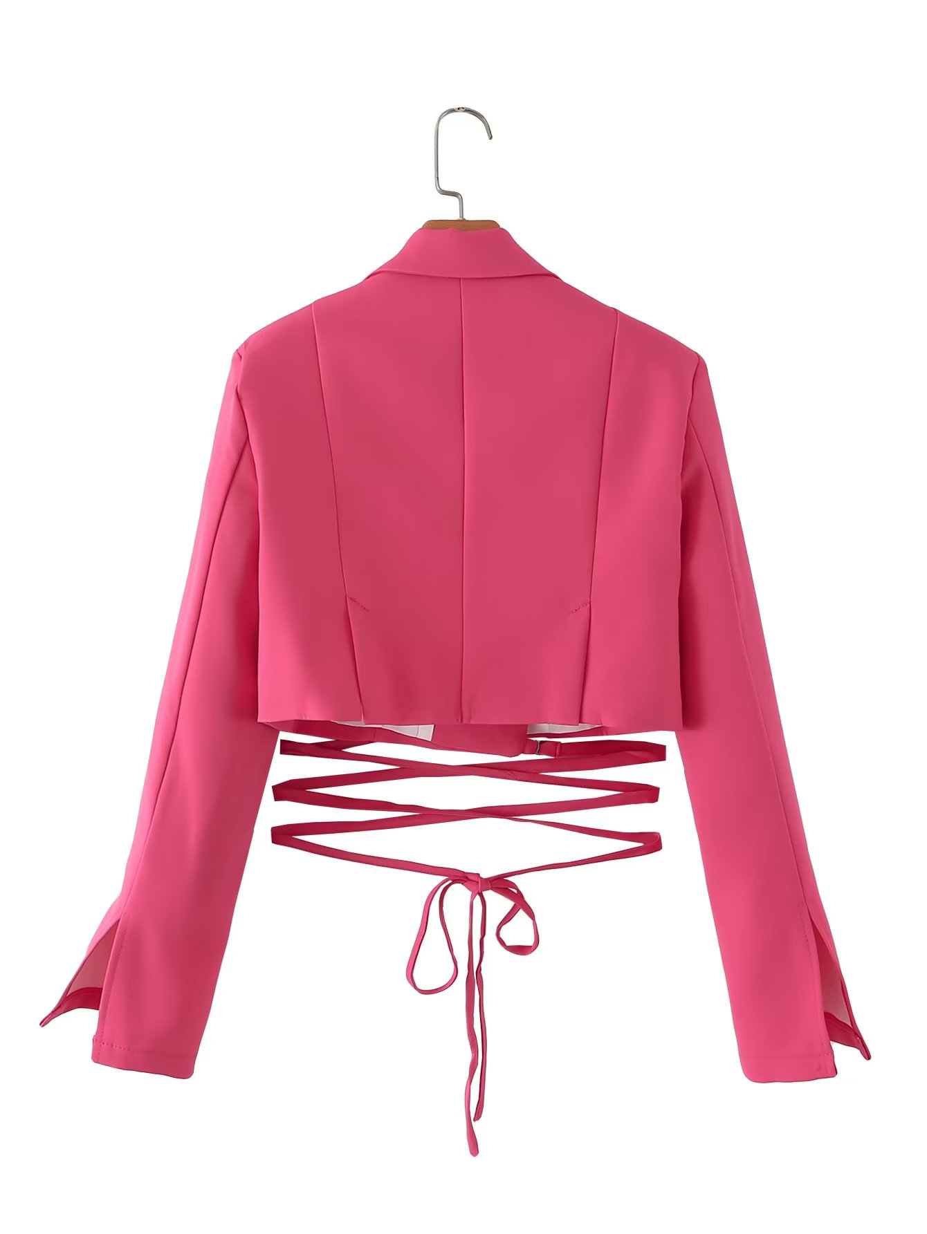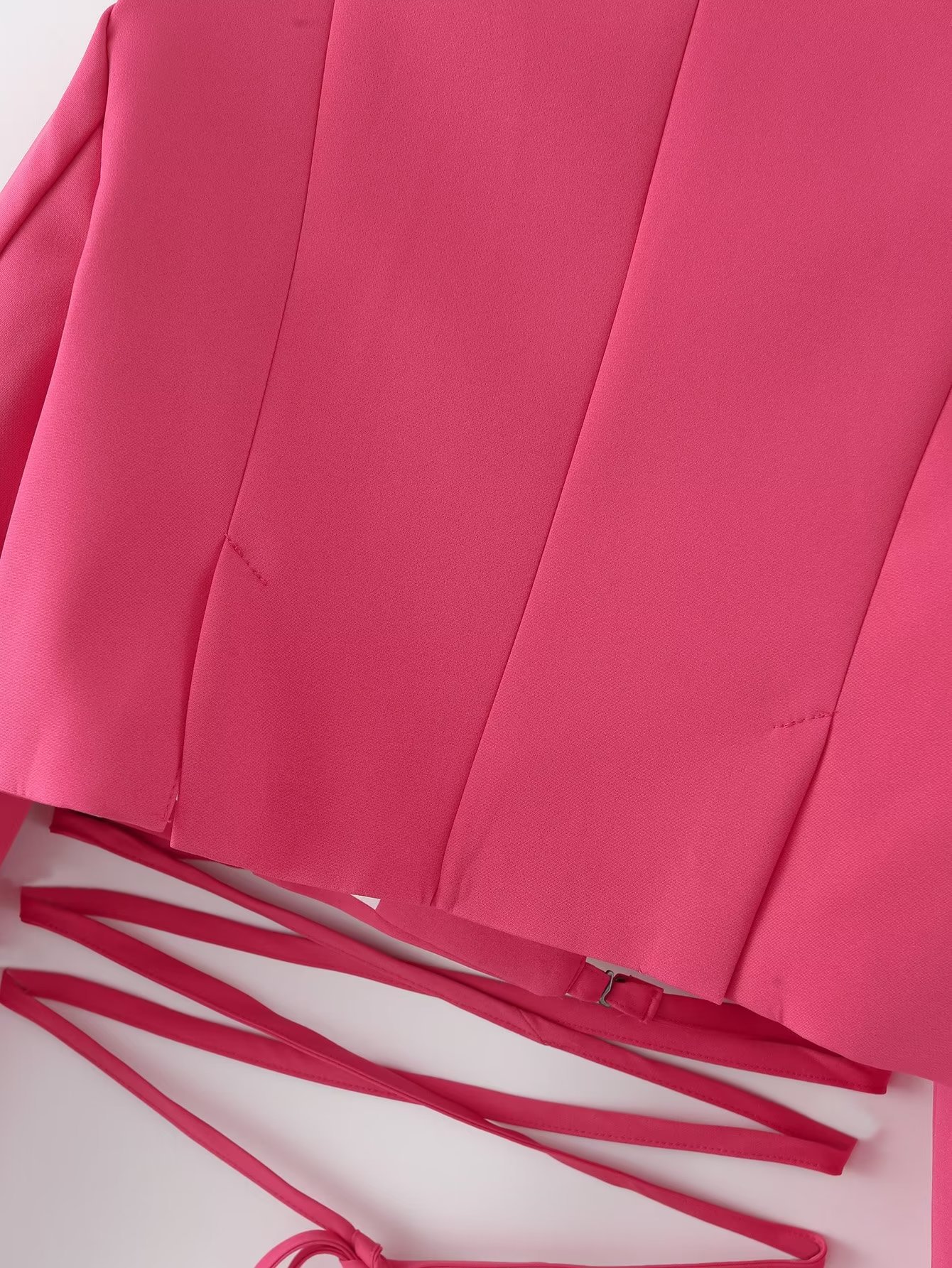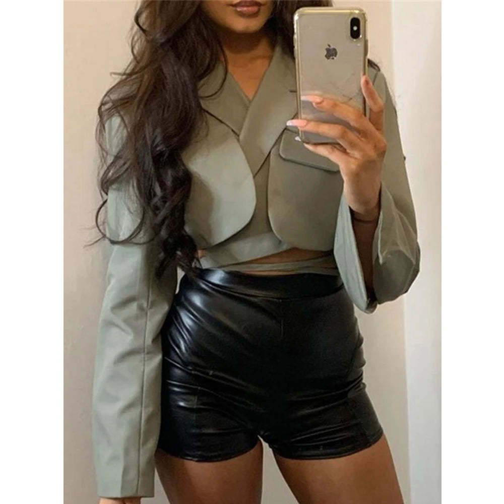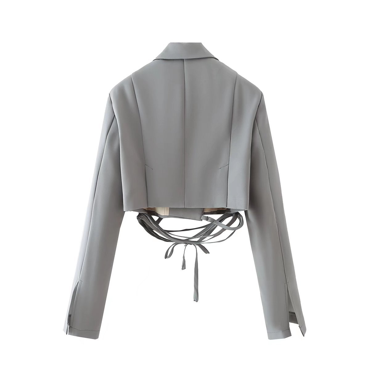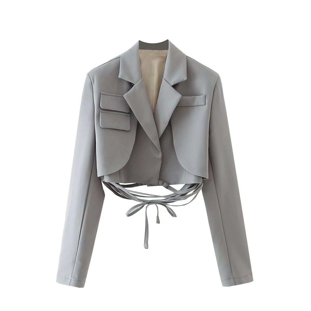 Gray Double Layer Bandage Slim Blazer Desigual Women Long Sleeve Pocket Short Jacket Female Outwear Crop Tops