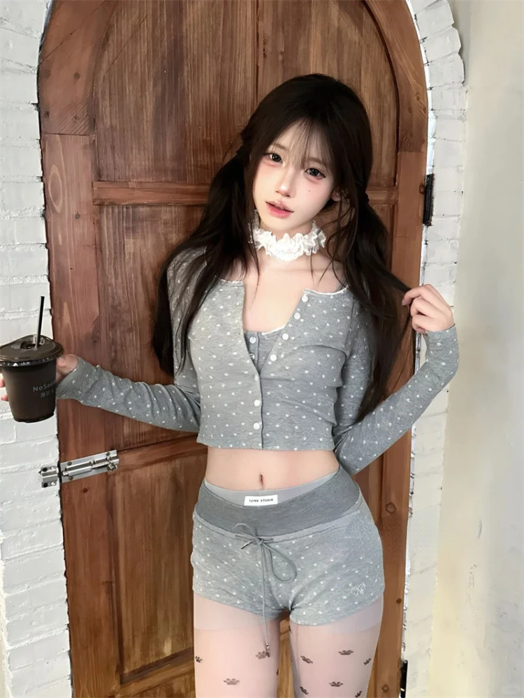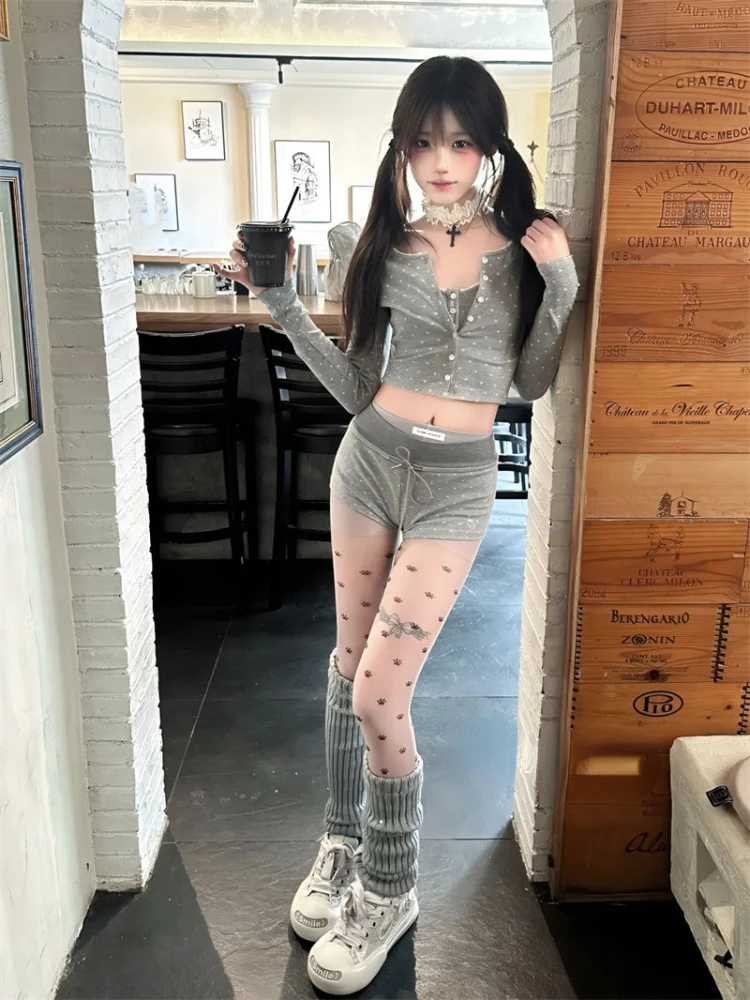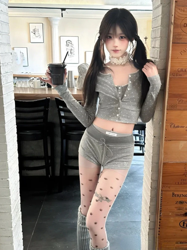 KYLETHOMASW - Japanese Kawaii 3 Piece Shorts Set Korean Sprot Suits Sexy 2024 Summer Sexy Long Sleeve Y2k Crop Tops Casual Party Short Pants