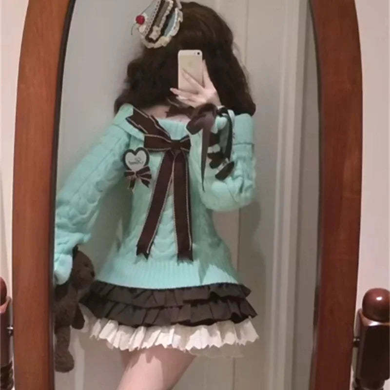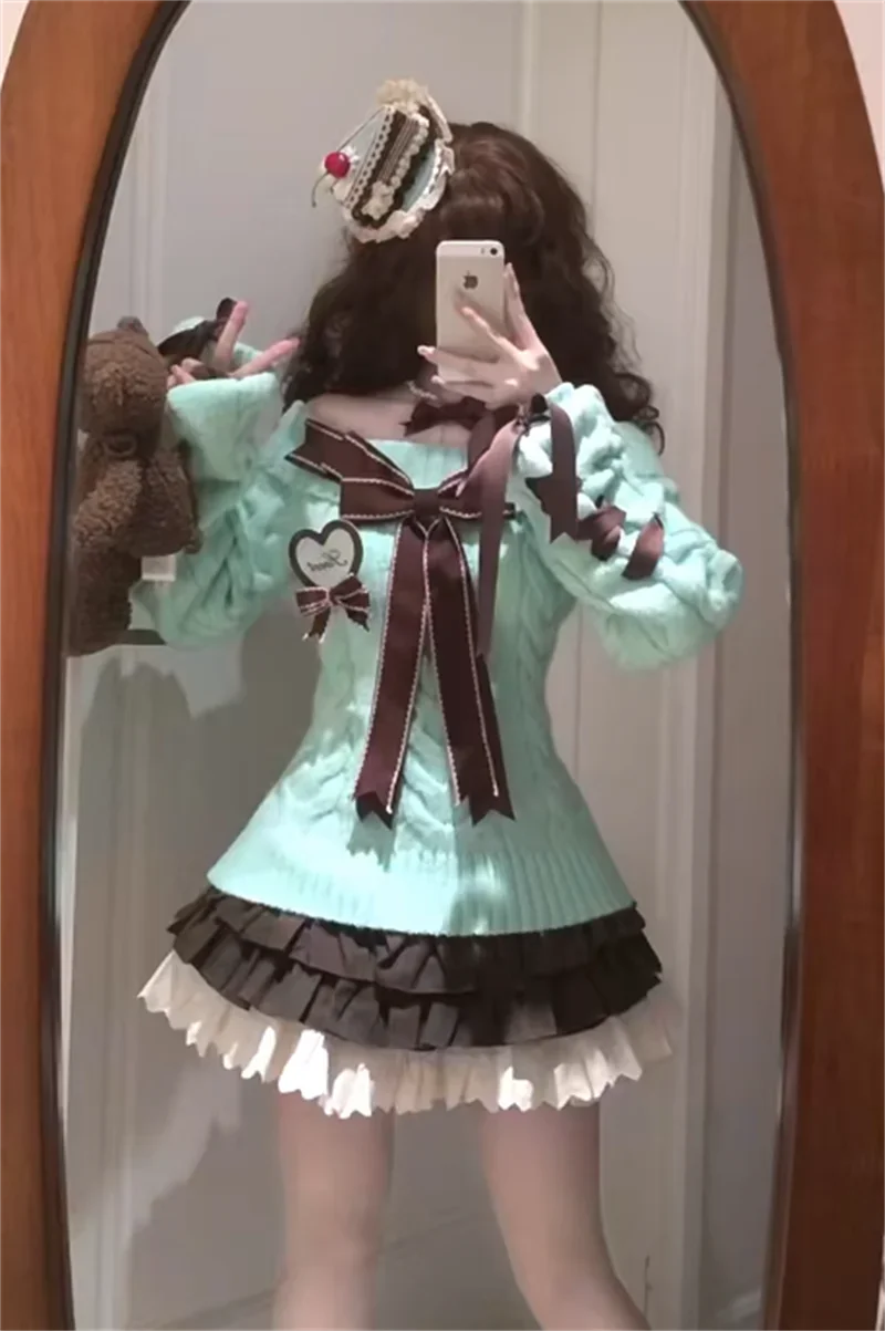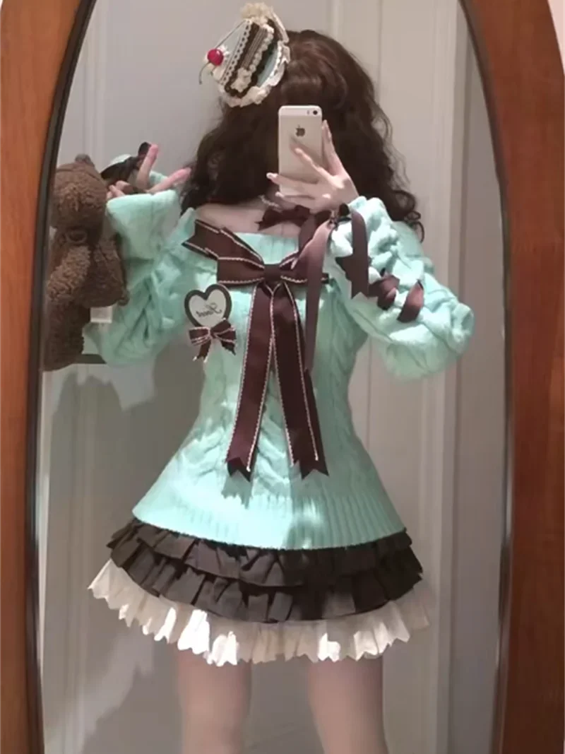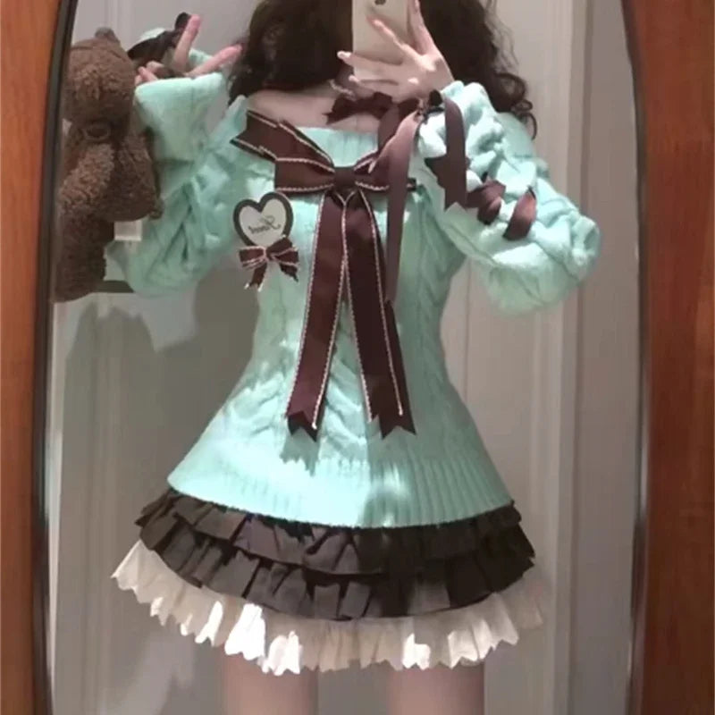 KYLETHOMASW - Kawaii Sweet Sweaters Off Shoulder Sexy Elegant Bow Patchwork Knitted Pullover Preppy Style Cute Long Sleeve Sweaters