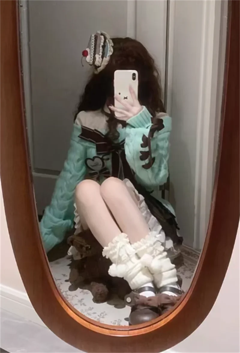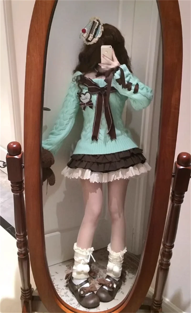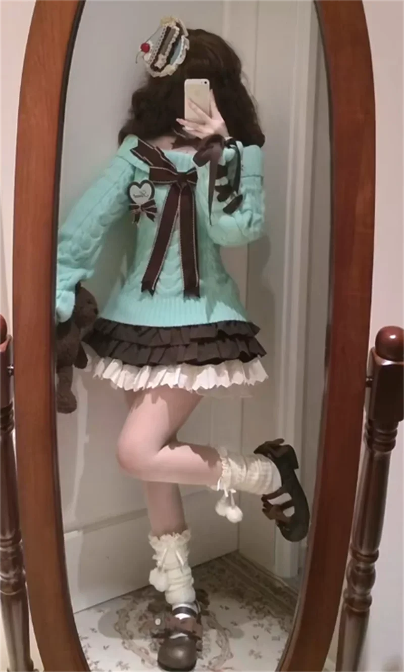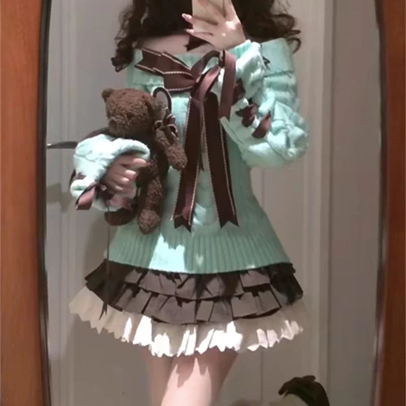 KYLETHOMASW - Kawaii Sweet Sweaters Off Shoulder Sexy Elegant Bow Patchwork Knitted Pullover Preppy Style Cute Long Sleeve Sweaters